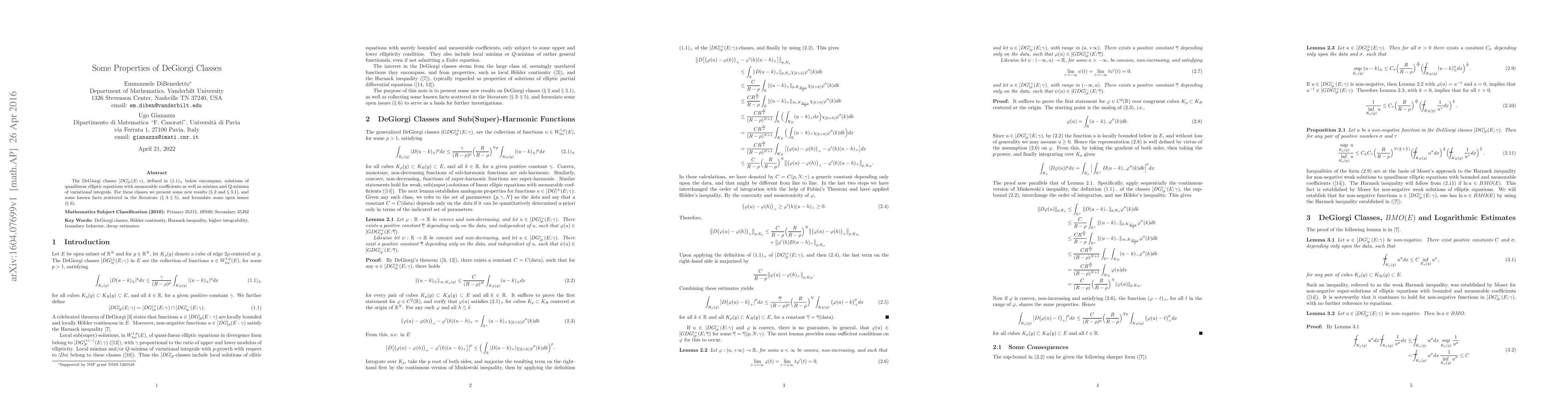 The paper presents new results and known facts consolidated for DeGiorgi classes, along with logarithmic estimates and higher integrability results for gradients, contributing to the theory of PDEs and variational integrals.