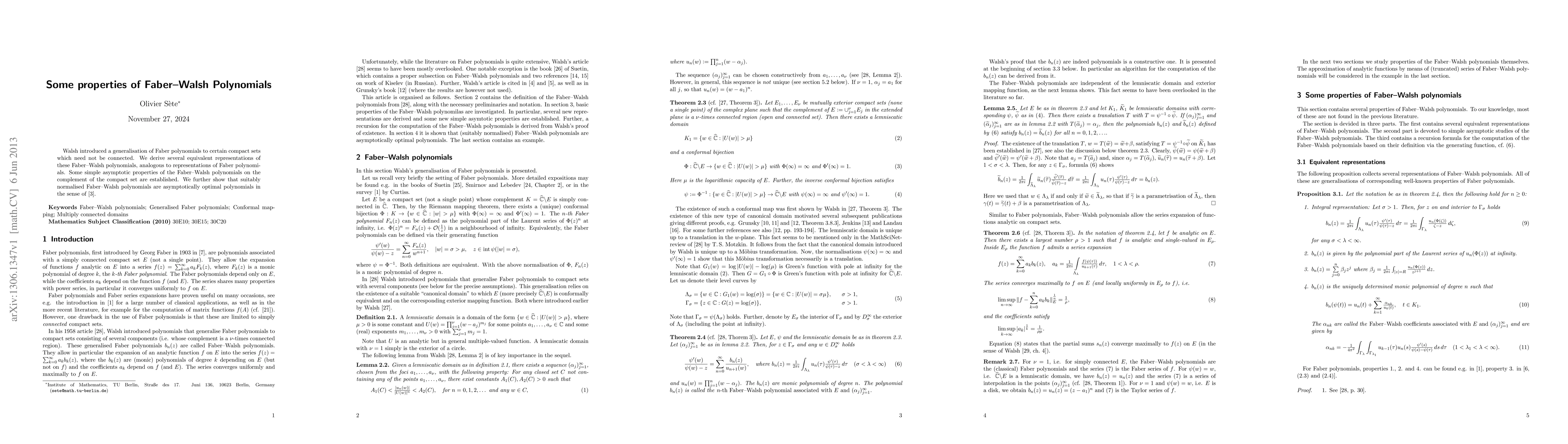 This paper explores the properties of Faber-Walsh polynomials, a generalization of Faber polynomials for non-connected compact sets. It establishes equivalent representations and asymptotic properties, demonstrating that normalized Faber-Walsh polynomials are asymptotically optimal in the context of polynomial approximation.
