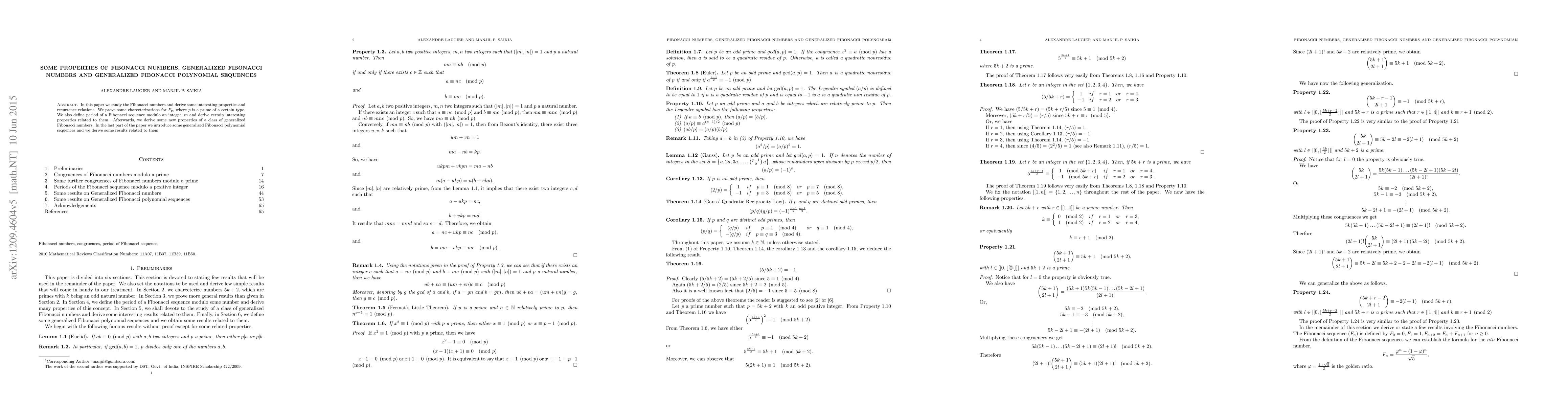 This paper explores properties and recurrence relations of Fibonacci numbers, including characterizations for specific primes and the period of Fibonacci sequences modulo integers. It also introduces generalized Fibonacci numbers and polynomial sequences, deriving new properties for these extended sequences.