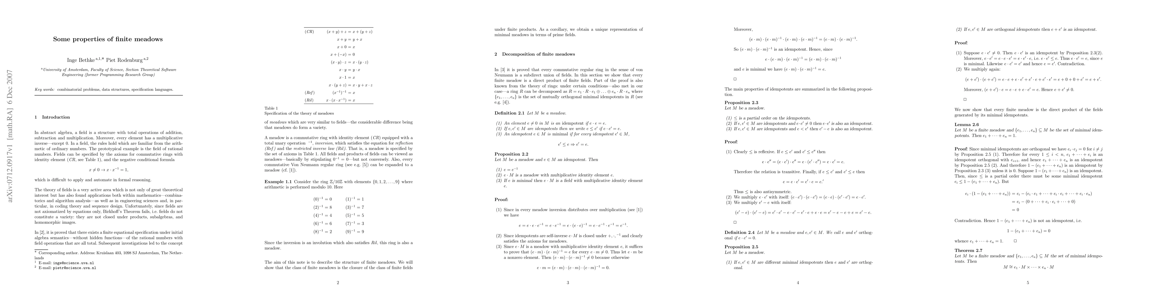 This paper explores the structural properties of finite meadows, demonstrating that they form a class closed under finite products of finite fields, and provides a unique representation of minimal meadows in terms of prime fields.