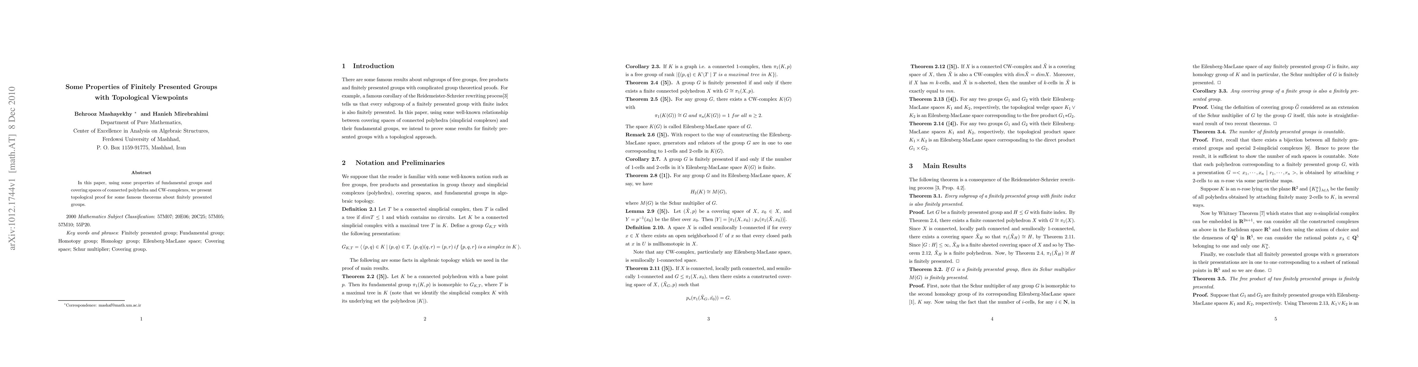 This paper utilizes topological methods, specifically properties of fundamental groups and covering spaces of polyhedra and CW-complexes, to provide new proofs for well-known theorems concerning finitely presented groups.