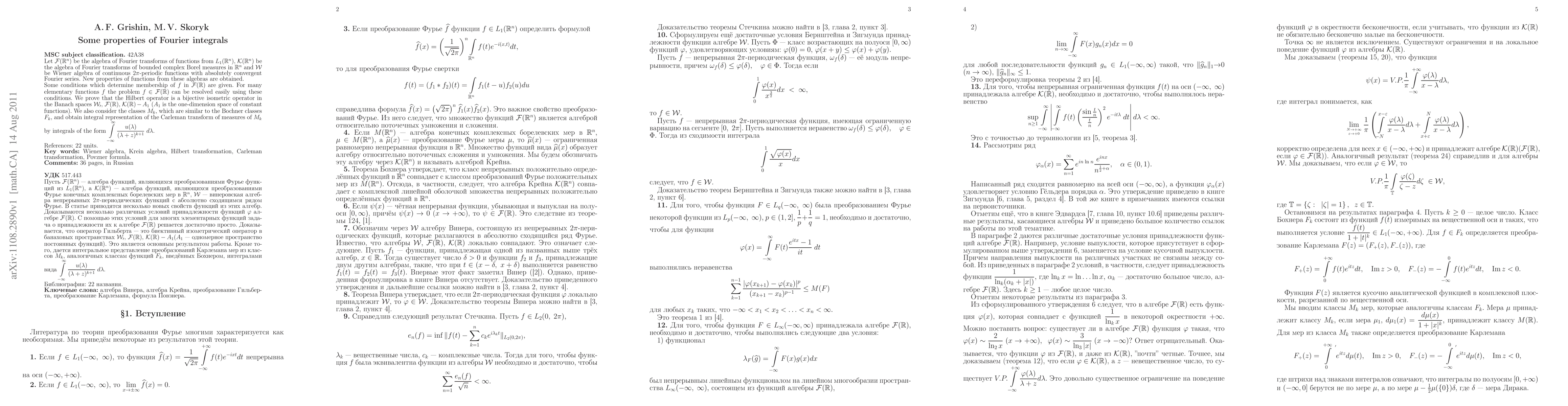 Let F(R^n) be the algebra of Fourier transforms of functions from L_1(R^n), K(R^n) be the algebra of Fourier transforms of bounded complex Borel measures in R^n and W be Wiener algebra of continuous 2pi-periodic functions with absolutely convergent Fourier series. New properties of functions from these algebras are obtained. Some conditions which determine membership of f in F(R) are given. For many elementary functions f the problem of belonging f to F(R) can be resolved easily using these conditions. We prove that the Hilbert operator is a bijective isometric operator in the Banach spaces W_0, F(R), K(R)-A_1 (A_1 is the one-dimension space of constant functions). We also consider the classes M_k, which are similar to the Bochner classes F_k, and obtain integral representation of the Carleman transform of measures of M_k by integrals of some specific form.