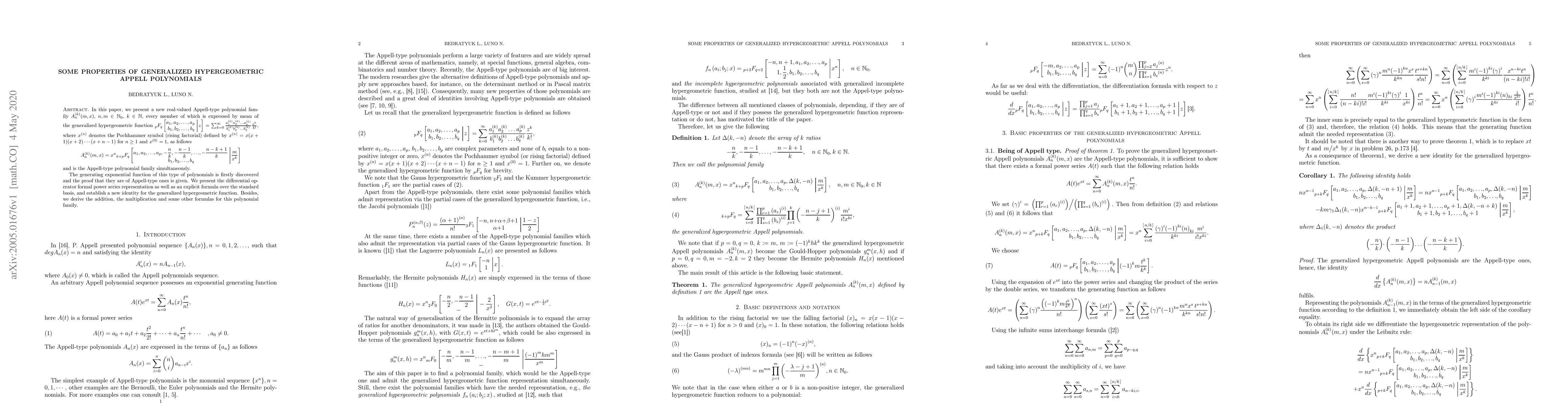 In this paper, we present a new real-valued Appell-type polynomial family $A_n^{(k)}(m,x), $ every member of which is expressed by mean of a generalized hypergeometric function. The generating exponential function of this type of polynomials is firstly discovered and the proof that they are of Appell-type ones is given. We present the differential operator formal power series representation as well as an explicit formula over the standard basis, and establish a new identity for the generalized hypergeometric function. Besides, we derive the addition, the multiplication and some other formulas for this polynomial family