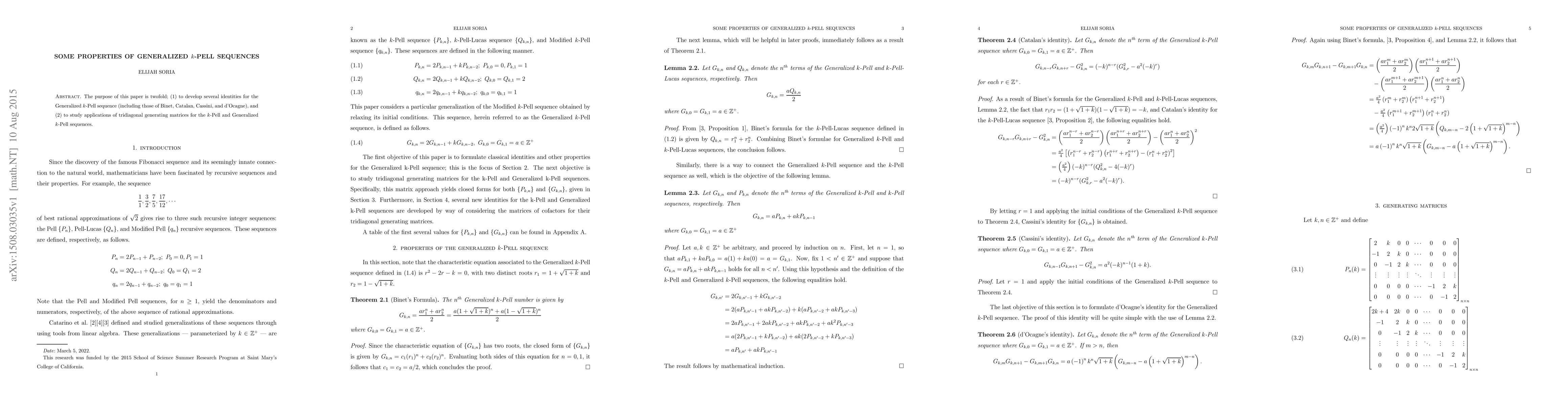 This paper develops identities for the Generalized $k$-Pell sequence, including Binet, Catalan, Cassini, and d'Ocagne forms, and explores applications of tridiagonal generating matrices for $k$-Pell and Generalized $k$-Pell sequences.