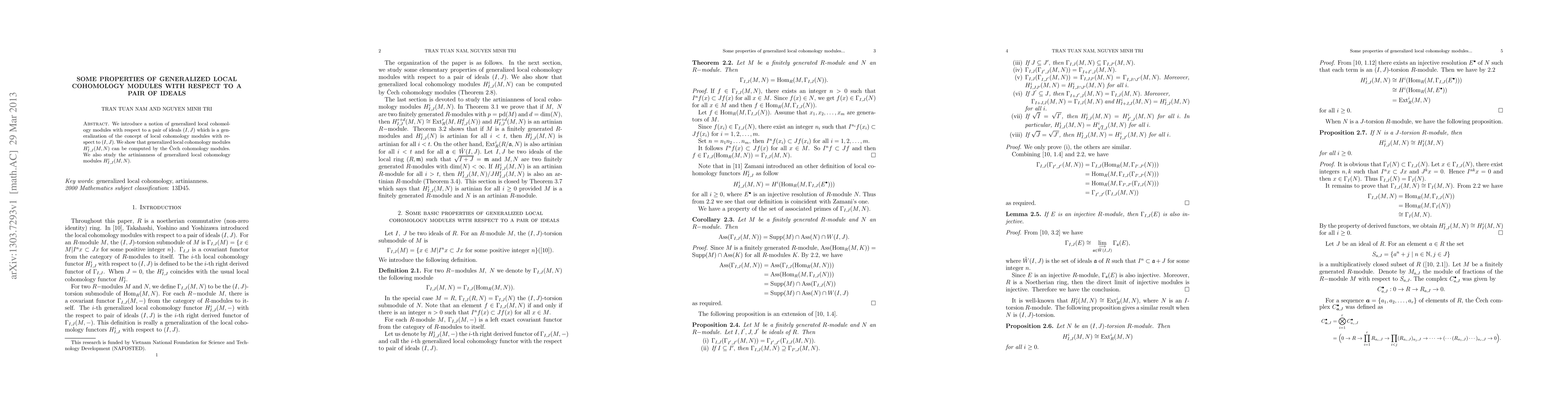 This paper introduces generalized local cohomology modules $H^i_{I,J}(M,N)$ with respect to a pair of ideals $(I,J)$, generalizing the concept of local cohomology modules. It demonstrates that these modules can be computed using \v{C}ech cohomology and investigates their artinianness properties.