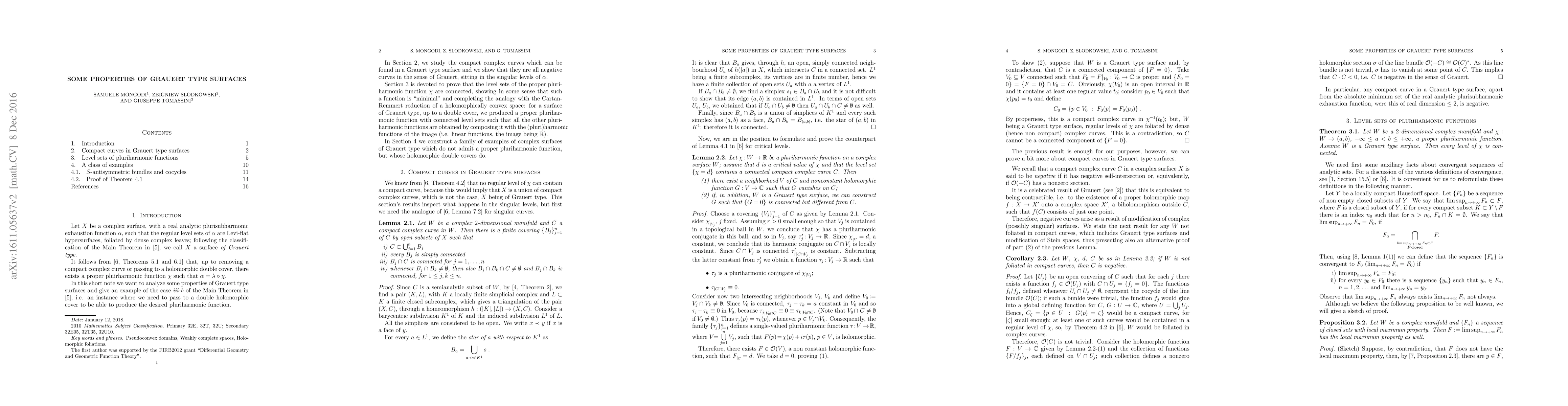Research paper investigates properties of Grauert type surfaces, proving that only negative compact curves can be contained within them and their pluriharmonic level sets are connected, analogous to the Remmert-Stein reduction.