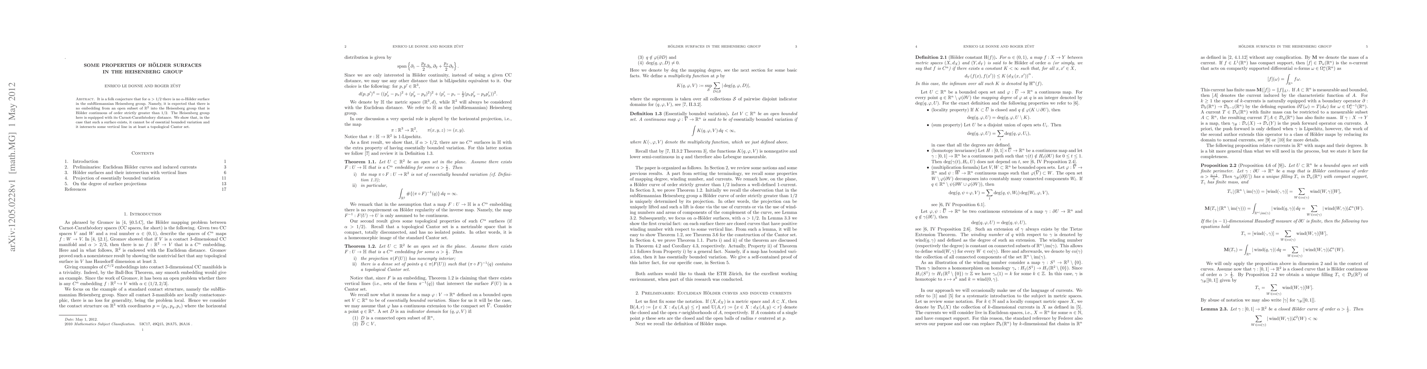 It is a folk conjecture that for alpha > 1/2 there is no alpha-Hoelder surface in the subRiemannian Heisenberg group. Namely, it is expected that there is no embedding from an open subset of R^2 into the Heisenberg group that is Hoelder continuous of order strictly greater than 1/2. The Heisenberg group here is equipped with its Carnot-Caratheodory distance. We show that, in the case that such a surface exists, it cannot be of essential bounded variation and it intersects some vertical line in at least a topological Cantor set.