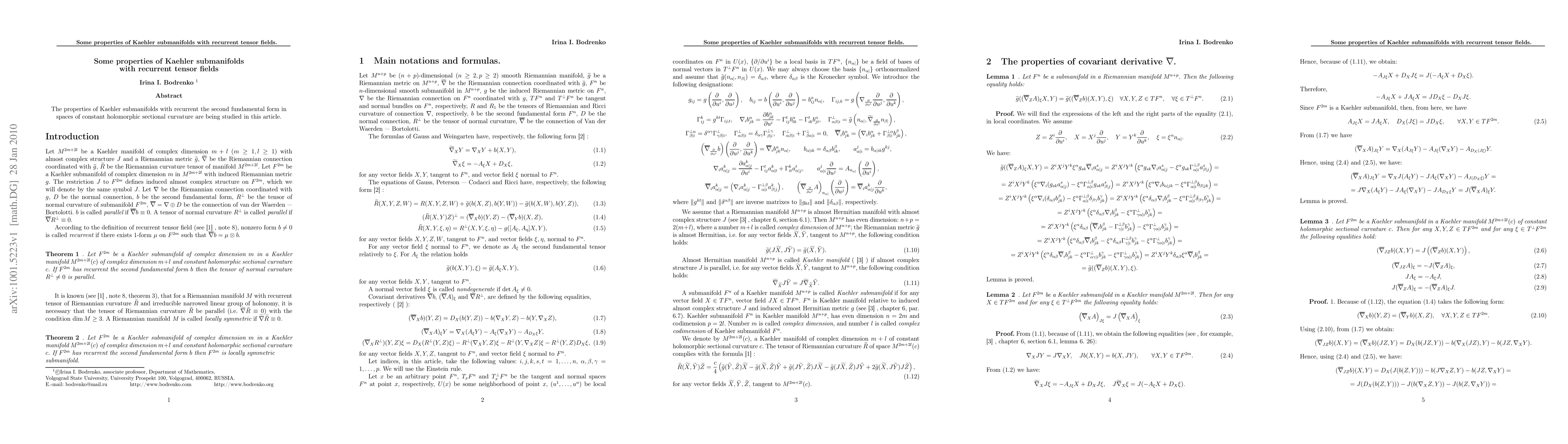 The properties of Kaehler submanifolds with recurrent the second fundamental form in spaces of constant holomorphic sectional curvature are being studied in this article.