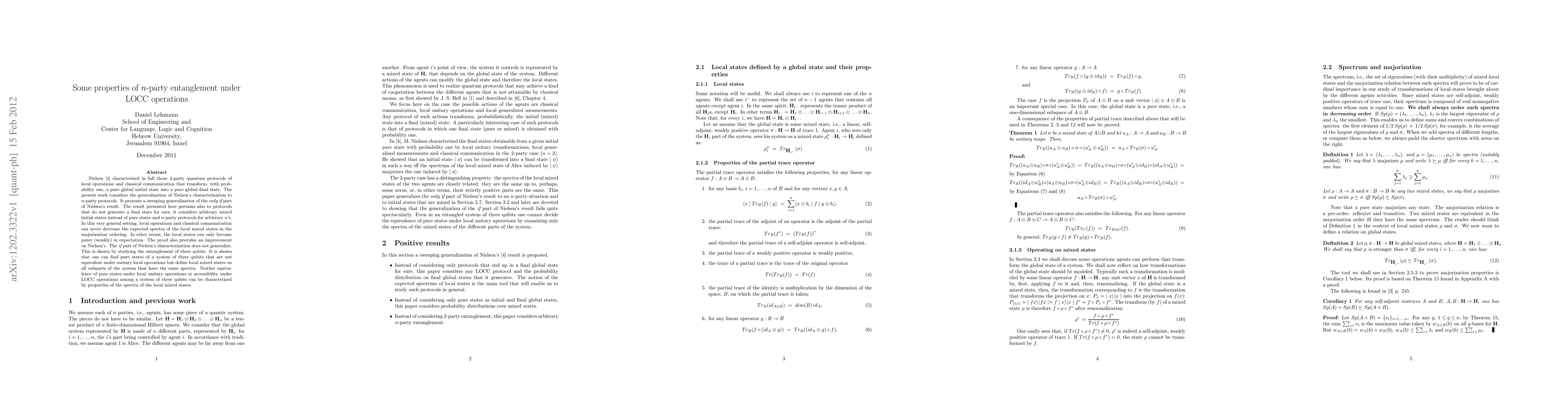 This paper generalizes Nielsen's characterization of 2-party quantum protocols to n-party protocols, showing that local operations and classical communication cannot decrease the expected spectra of local mixed states in majorization ordering. However, the "if" part of Nielsen's result does not generalize, as demonstrated through the entanglement of three qubits.