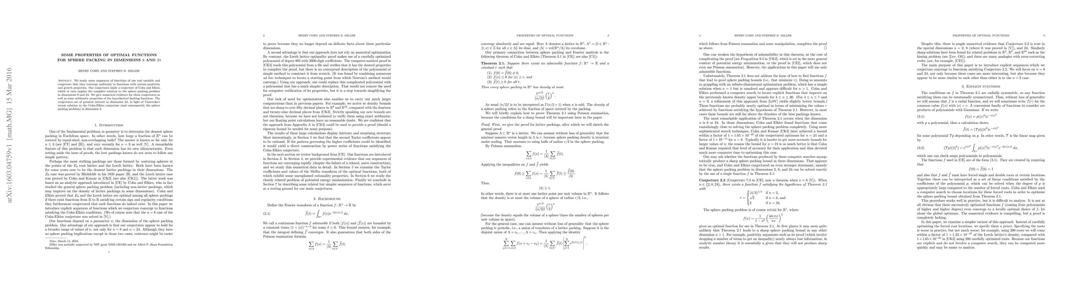 This paper explores sequences of functions that are hypothesized to converge to optimal sphere packing functions in dimensions 8 and 24, supporting a conjecture by Cohn and Elkies and implying the complete solution to the sphere packing problem in these dimensions. The study provides numerical evidence and examines arithmetic properties of the conjectured limiting functions, with particular focus on dimension 24.