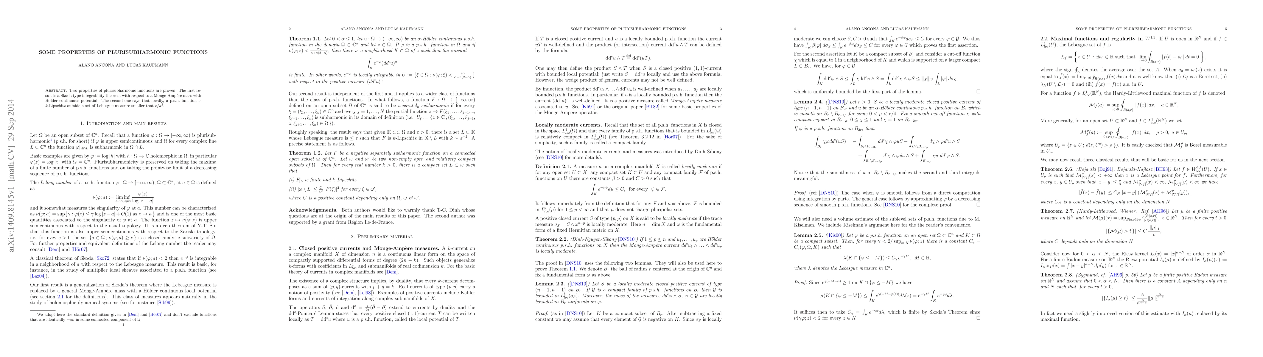 Two properties of plurisubharmonic functions are proven. The first result is a Skoda type integrability theorem with respect to a Monge-Amp\`ere mass with H\"older continuous potential. The second one says that locally, a p.s.h. function is $k$-Lipschitz outside a set of Lebesgue measure smaller that $c/k^2$.