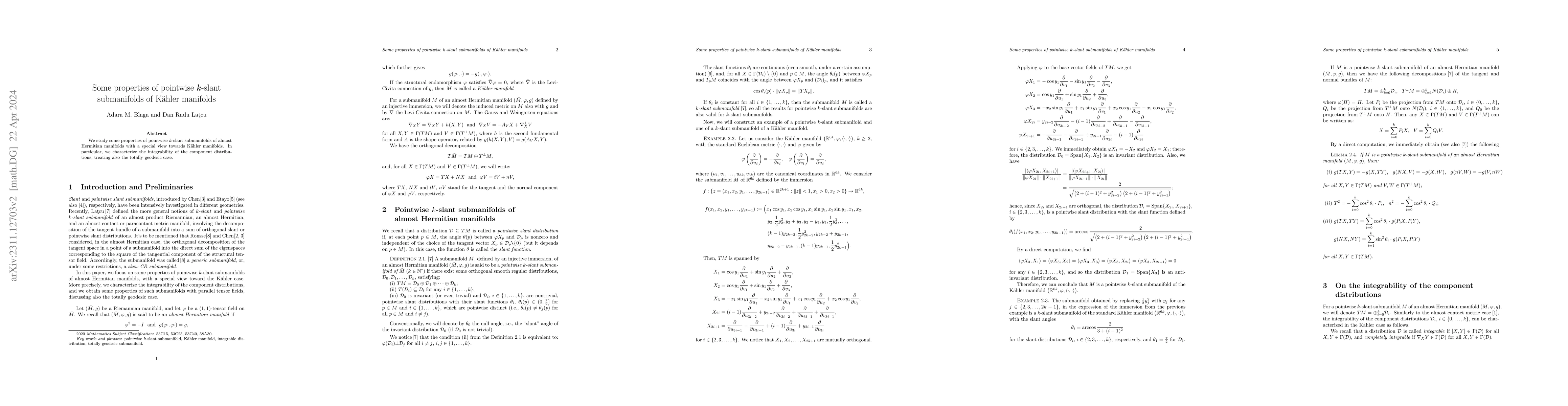 Summary: This research investigates properties of pointwise $k$-slant submanifolds within Kähler manifolds, focusing on the integrability of their component distributions and examining the cases where they are totally geodesic.