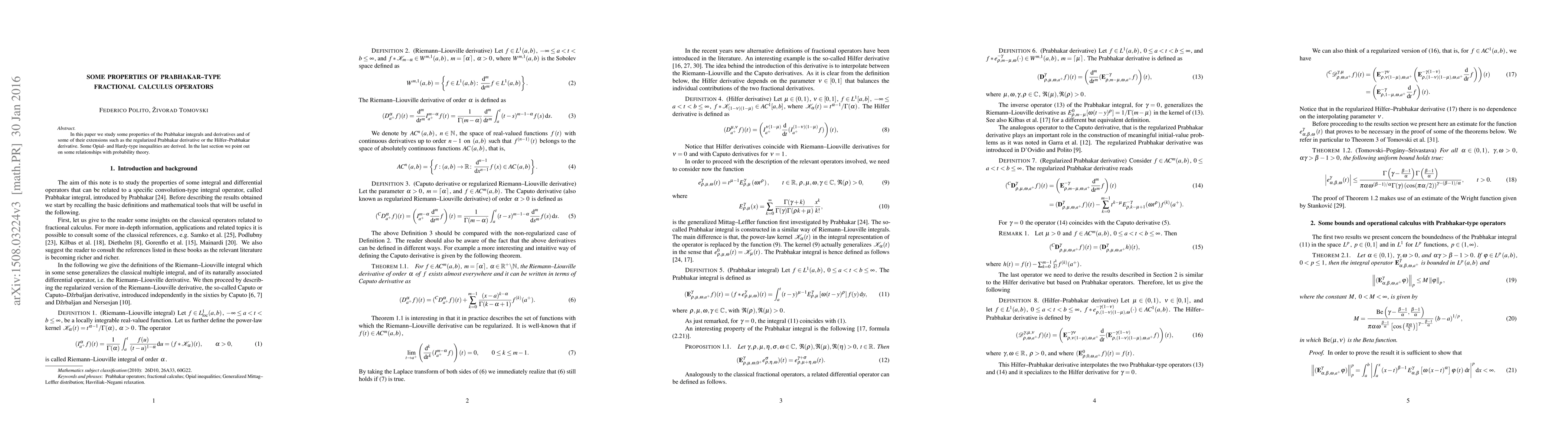 In this paper we study some properties of the Prabhakar integrals and derivatives and of some of their extensions such as the regularized Prabhakar derivative or the Hilfer--Prabhakar derivative. Some Opial- and Hardy-type inequalities are derived. In the last section we point out on some relationships with probability theory.