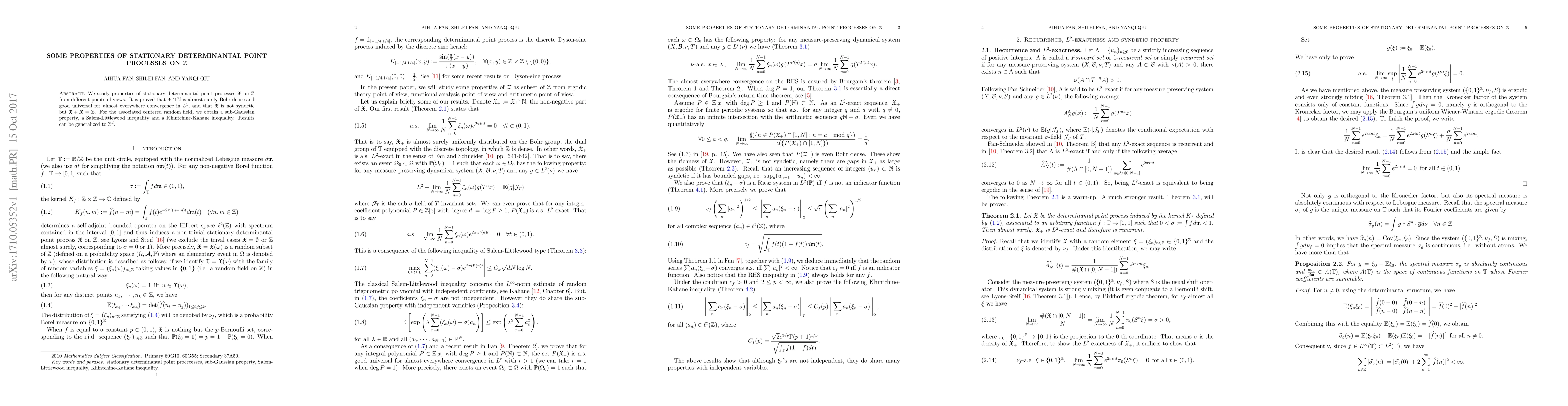 We study properties of stationary determinantal point processes $\X$ on $\Z$ from different points of views. It is proved that $\X\cap \N$ is almost surely Bohr-dense and good universal for almost everywhere convergence in $L^1$, and that $\X$ is not syndetic but $\X +\X = \mathbb{Z}$. For the associated centered random field, we obtain a sub-Gaussian property, a Salem-Littlewood inequality and a Khintchine-Kahane inequality. Results can be generalized to $\Z^d$.