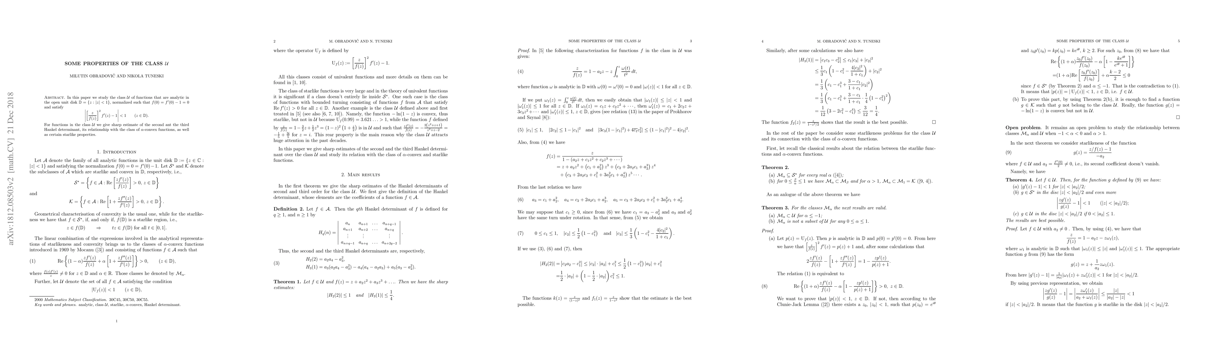 In this paper we study the class $\mathcal{U}$ of functions that are analytic in the open unit disk ${\mathbb D}=\{z:|z|<1\}$, normalized such that $f(0)=f'(0)-1=0$ and satisfy \[\left|\left [\frac{z}{f(z)} \right]^{2}f'(z)-1 \right|<1\quad\quad (z\in {\mathbb D}).\] For functions in the class $\mathcal{U}$ we give sharp estimate of the second ant the third Hankel determinant, its relationship with the class of $\alpha$-convex functions, as well as certain starlike properties.