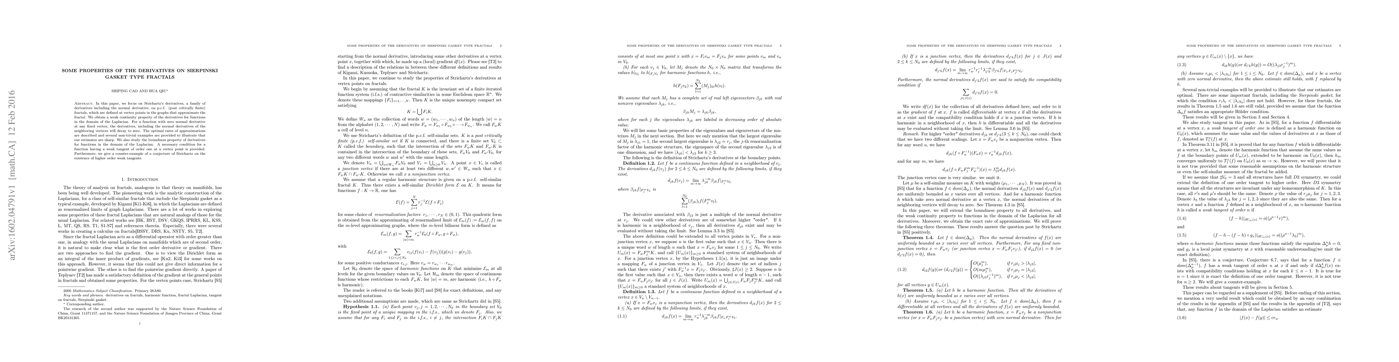 In this paper, we focus on Strichartz's derivatives, a family of derivatives including the normal derivative, on p.c.f. (post critically finite) fractals, which are defined at vertex points in the graphs that approximate the fractal. We obtain a weak continuity property of the derivatives for functions in the domain of the Laplacian. For a function with zero normal derivative at any fixed vertex, the derivatives, including the normal derivatives of the neighboring vertices will decay to zero. The optimal rates of approximations are described and several non-trivial examples are provided to illustrate that our estimates are sharp. We also study the boundness property of derivatives for functions in the domain of the Laplacian. A necessary condition for a function having a weak tangent of order one at a vertex point is provided. Furthermore, we give a counter-example of a conjecture of Strichartz on the existence of higher order weak tangents.