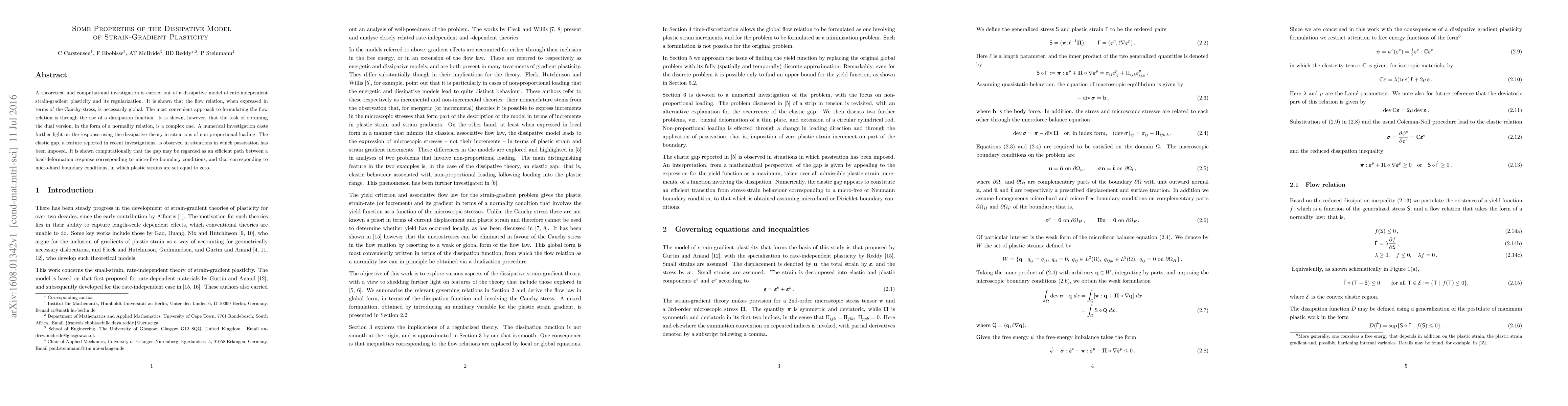 A theoretical and computational investigation is carried out of a dissipative model of rate-independent strain-gradient plasticity and its regularization. It is shown that the flow relation, when expressed in terms of the Cauchy stress, is necessarily global. The most convenient approach to formulating the flow relation is through the use of a dissipation function. It is shown, however, that the task of obtaining the dual version, in the form of a normality relation, is a complex one. A numerical investigation casts further light on the response using the dissipative theory in situations of non-proportional loading. The elastic gap, a feature reported in recent investigations, is observed in situations in which passivation has been imposed. It is shown computationally that the gap may be regarded as an efficient path between a load-deformation response corresponding to micro-free boundary conditions, and that corresponding to micro-hard boundary conditions, in which plastic strains are set equal to zero.