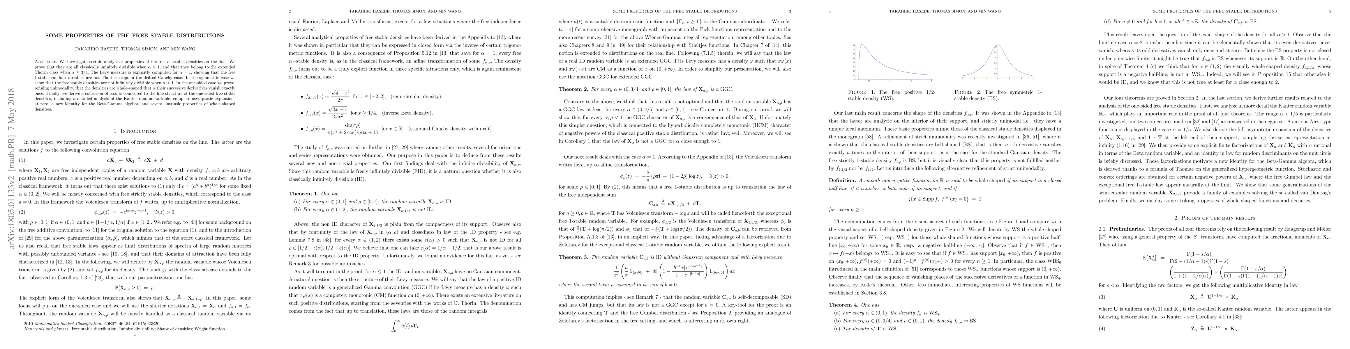 We investigate certain analytical properties of the free $\alpha-$stable densities on the line. We prove that they are all classically infinitely divisible when $\alpha\le 1$, and that they belong to the extended Thorin class when $\alpha \leq 3/4.$ The L\'evy measure is explicitly computed for $\alpha =1,$ showing that the free 1-stable random variables are not Thorin except in the drifted Cauchy case. In the symmetric case we show that the free stable densities are not infinitely divisible when $\alpha > 1.$ In the one-sided case we prove, refining unimodality, that the densities are whale-shaped that is their successive derivatives vanish exactly once. Finally, we derive a collection of results connected to the fine structure of the one-sided free stable densities, including a detailed analysis of the Kanter random variable, complete asymptotic expansions at zero, a new identity for the Beta-Gamma algebra, and several intrinsic properties of whale-shaped densities.