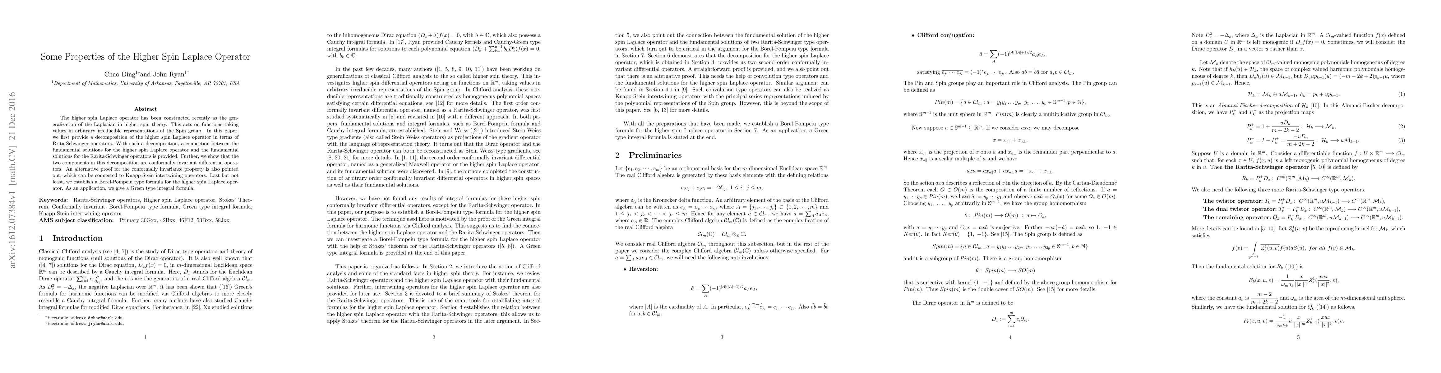This paper explores properties of the higher spin Laplace operator, including its decomposition into conformally invariant differential operators and a Borel-Pompeiu type formula, with implications for applications in higher spin theory.