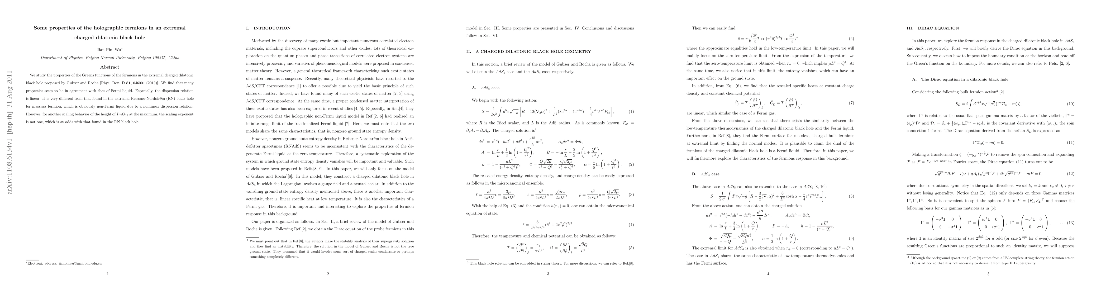 Research on fermions in an extremal charged dilatonic black hole reveals linear dispersion relations and scaling behaviors similar to those of Fermi liquids, but with some differences from other black hole models.