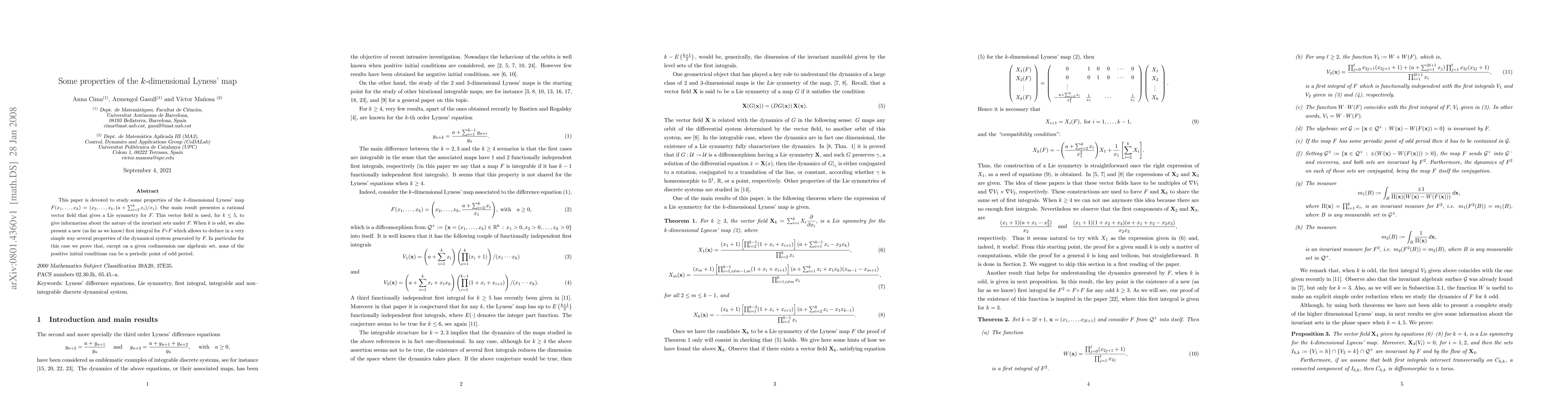 This paper is devoted to study some properties of the k-dimensional Lyness' map. Our main result presentes a rational vector field that gives a Lie symmetry for F. This vector field is used, for k less or equal to 5 to give information about the nature of the invariant sets under F. When k is odd, we also present a new (as far as we know) first integral for F^2 which allows to deduce in a very simple way several properties of the dynamical system generated by F. In particular for this case we prove that, except on a given codimension one algebraic set, none of the positive initial conditions can be a periodic point of odd period.