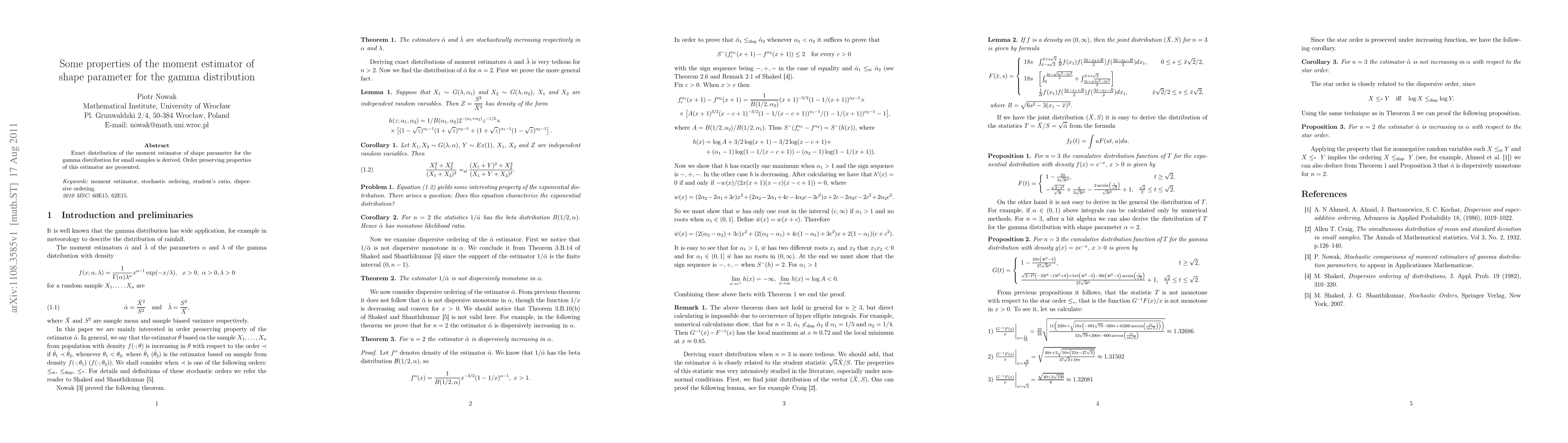Summary: This paper derives the exact distribution of the moment estimator for the shape parameter in the gamma distribution for small samples and discusses the order-preserving properties of this estimator.
