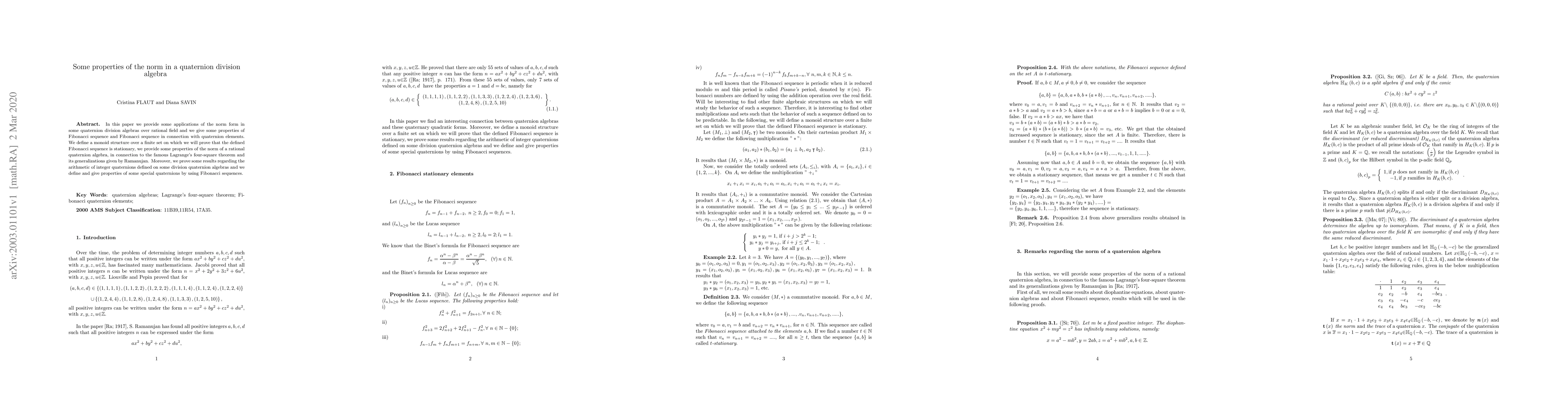 This paper explores the norm properties in quaternion division algebras over rational fields, linking them to Fibonacci sequences and monoid structures. It also connects these properties to Lagrange's four-square theorem and results on the arithmetic of integer quaternions, proving the stationarity of a defined Fibonacci sequence.