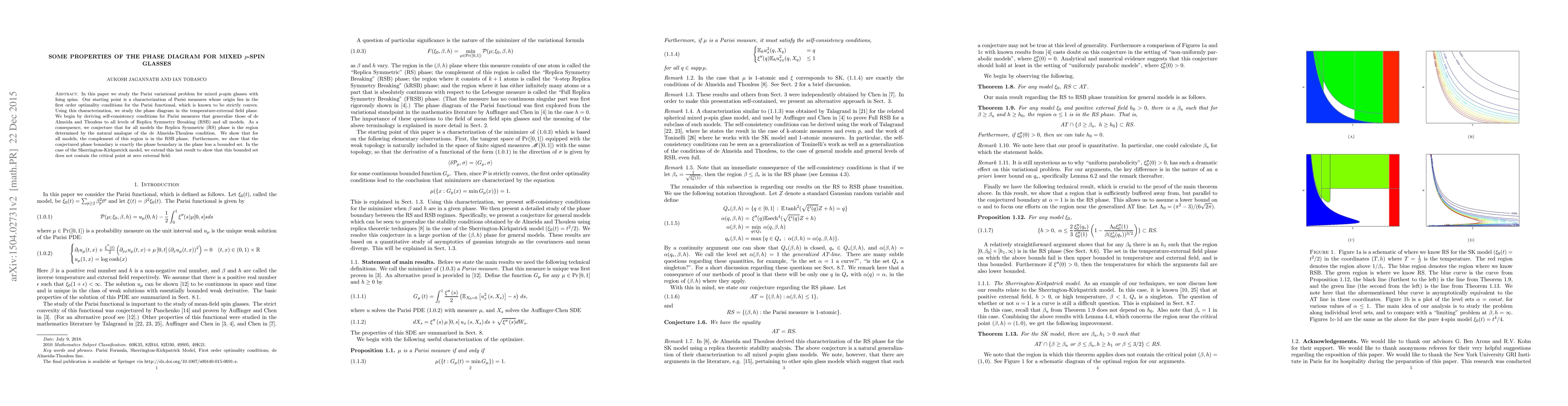 In this paper we study the Parisi variational problem for mixed $p$-spin glasses with Ising spins. Our starting point is a characterization of Parisi measures whose origin lies in the first order optimality conditions for the Parisi functional, which is known to be strictly convex. Using this characterization, we study the phase diagram in the temperature-external field plane. We begin by deriving self-consistency conditions for Parisi measures that generalize those of de Almeida and Thouless to all levels of Replica Symmetry Breaking (RSB) and all models. As a consequence, we conjecture that for all models the Replica Symmetric (RS) phase is the region determined by the natural analogue of the de Almeida-Thouless condition. We show that for all models, the complement of this region is in the RSB phase. Furthermore, we show that the conjectured phase boundary is exactly the phase boundary in the plane less a bounded set. In the case of the Sherrington-Kirkpatrick model, we extend this last result to show that this bounded set does not contain the critical point at zero external field.