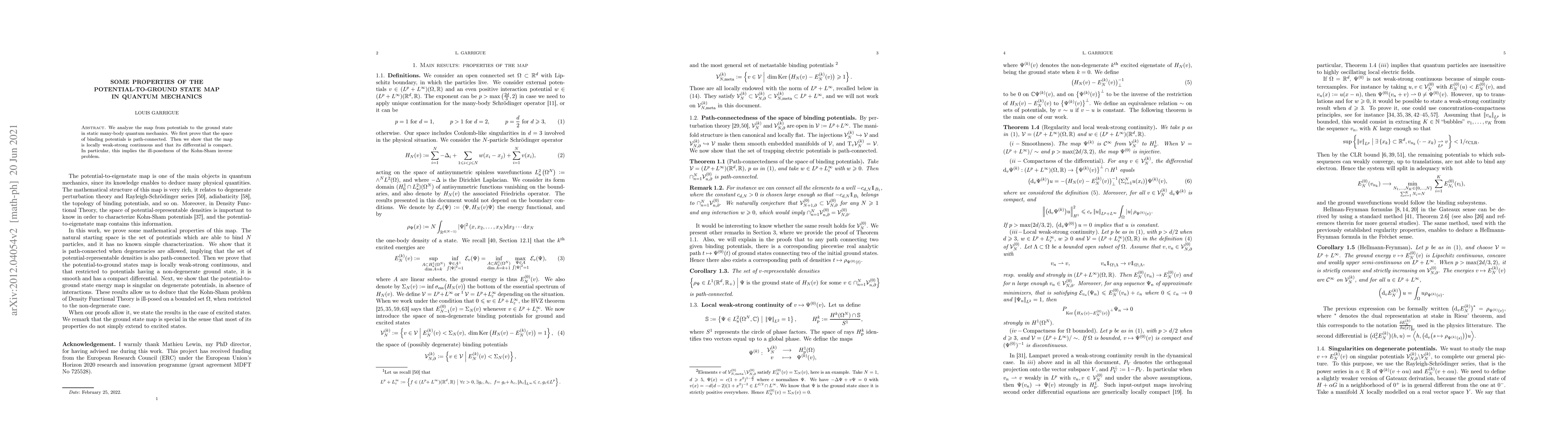 Researchers prove that the map from potential energy to ground state in quantum mechanics is path-connected and locally weak-strong continuous, but its differential is compact, implying the ill-posedness of certain problems like the Kohn-Sham inverse problem.
