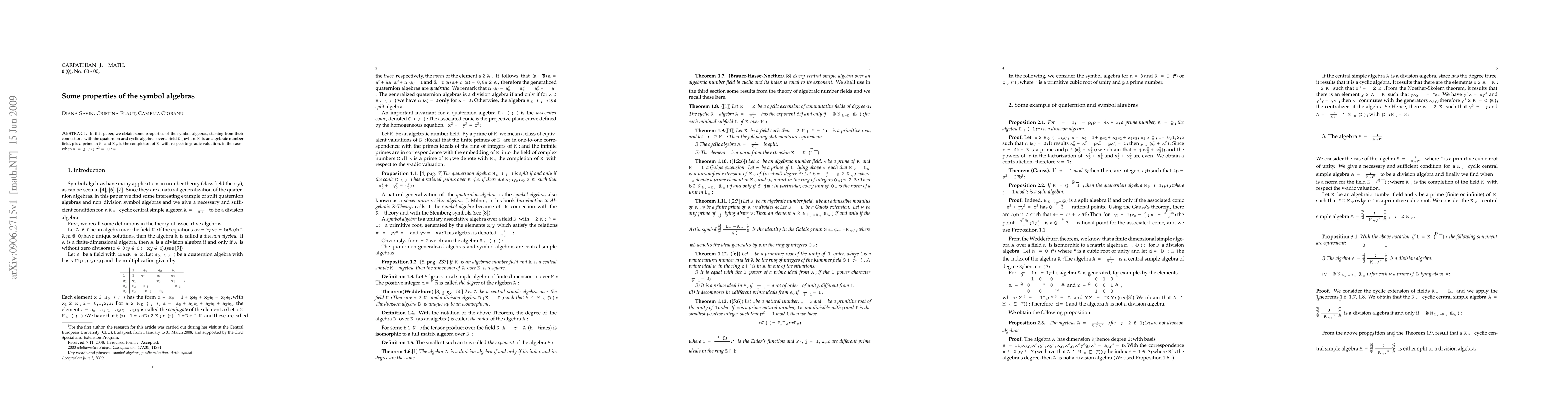 In this paper, we obtain some properties of the symbol algebras, starting from their connections with the quaternion and cyclic algebras over a field $K_{p},$% where $K$ is an algebraic number field, $p$ is a prime in $K$ and $K_{p}$ is the completion of $K$ with respect to $p-$ adic valuation, in the case when $K=\Bbb{Q}(\varepsilon), \varepsilon ^{3}=1,\varepsilon \neq 1.$