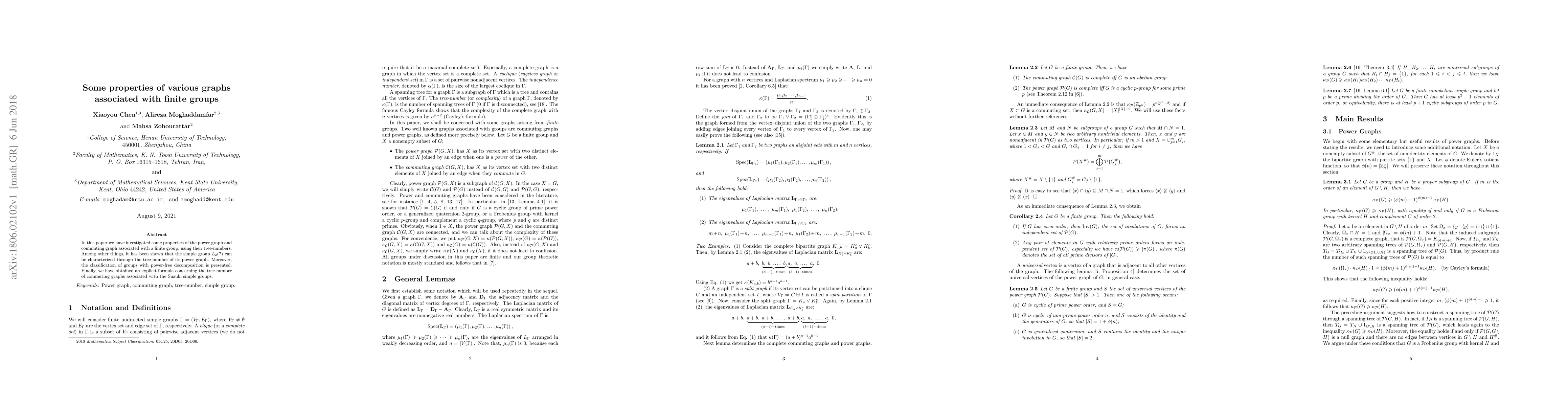 In this paper we have investigated some properties of the power graph and commuting graph associated with a finite group, using their tree-numbers. Among other things, it has been shown that the simple group $L_2(7)$ can be characterized through the tree-number of its power graph. Moreover, the classification of groups with power-free decomposition is presented. Finally, we have obtained an explicit formula concerning the tree-number of commuting graphs associated with the Suzuki simple groups.