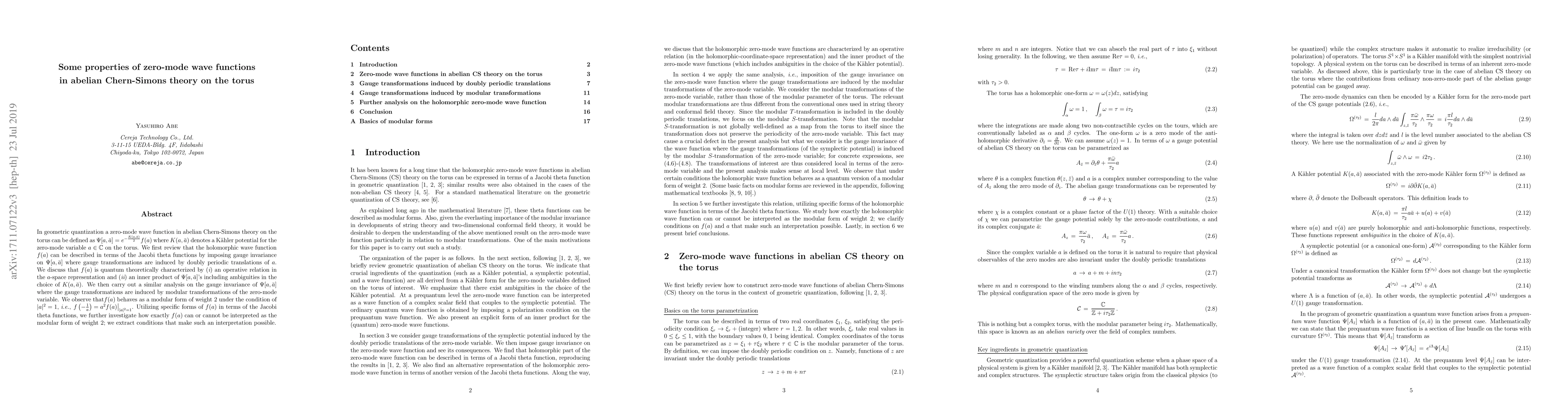 Researchers investigate properties of zero-mode wave functions in abelian Chern-Simons theory on the torus, finding that a specific function behaves as a modular form of weight 2 under certain conditions.