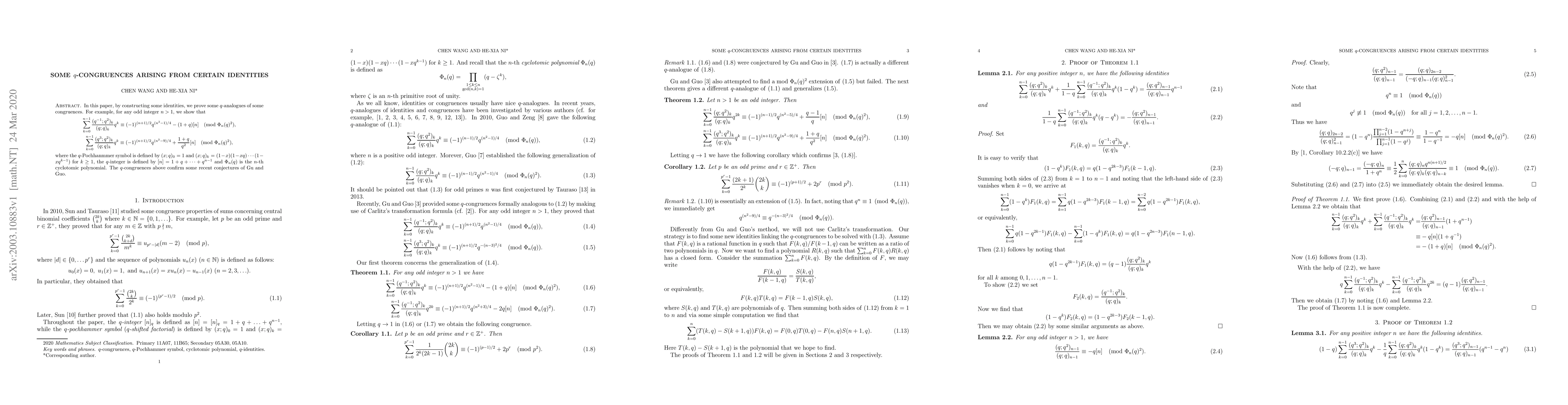 In this paper, by constructing some identities, we prove some $q$-analogues of some congruences. For example, for any odd integer $n>1$, we show that \begin{gather*} \sum_{k=0}^{n-1} \frac{(q^{-1};q^2)_k}{(q;q)_k} q^k \equiv (-1)^{(n+1)/2} q^{(n^2-1)/4} - (1+q)[n] \pmod{\Phi_n(q)^2},\\ \sum_{k=0}^{n-1}\frac{(q^3;q^2)_k}{(q;q)_k} q^k \equiv (-1)^{(n+1)/2} q^{(n^2-9)/4} + \frac{1+q}{q^2}[n]\pmod{\Phi_n(q)^2}, \end{gather*} where the $q$-Pochhanmmer symbol is defined by $(x;q)_0=1$ and $(x;q)_k = (1-x)(1-xq)\cdots(1-xq^{k-1})$ for $k\geq1$, the $q$-integer is defined by $[n]=1+q+\cdots+q^{n-1}$ and $\Phi_n(q)$ is the $n$-th cyclotomic polynomial. The $q$-congruences above confirm some recent conjectures of Gu and Guo.