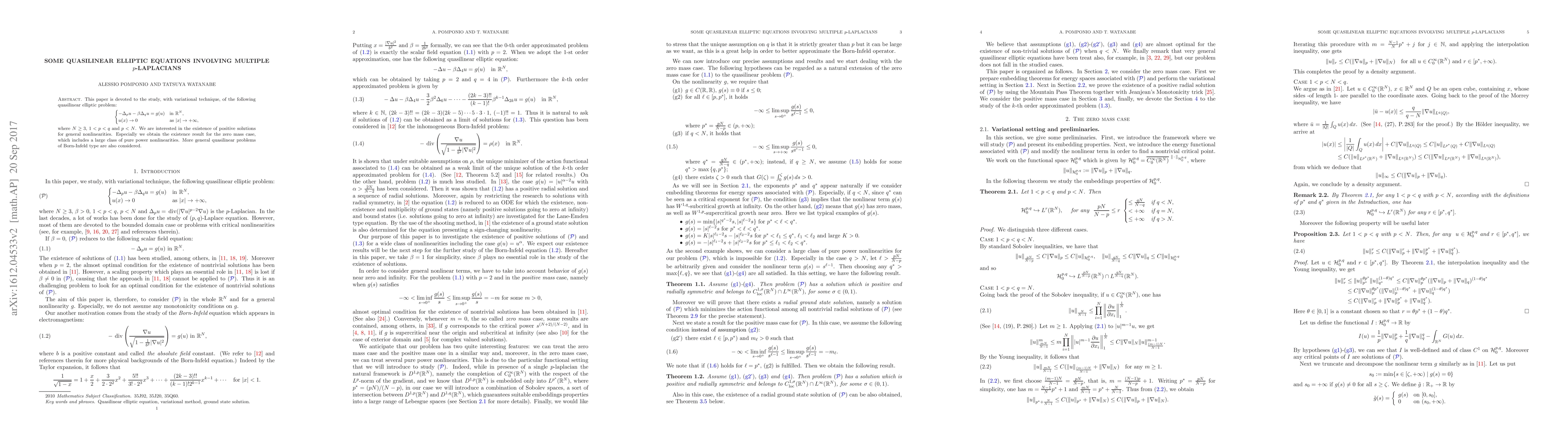 This paper investigates the existence of solutions for a class of quasilinear elliptic equations involving multiple p-Laplacians with general nonlinearities, focusing on pure power nonlinearity cases.