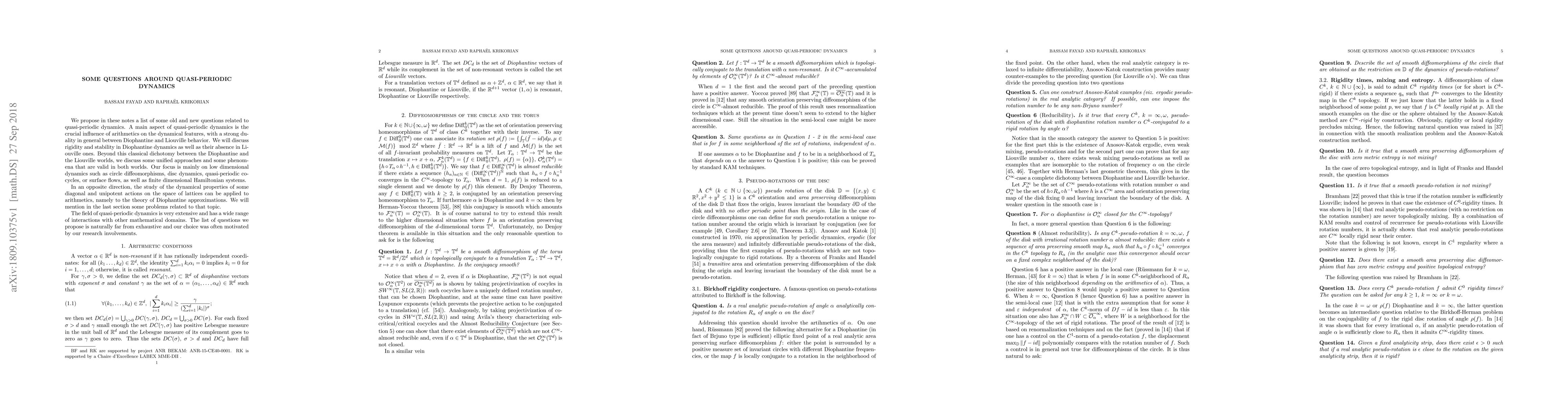 We propose in these notes a list of some old and new questions related to quasi-periodic dynamics. A main aspect of quasi-periodic dynamics is the crucial influence of arithmetics on the dynamical features, with a strong duality in general between Diophantine and Liouville behavior. We will discuss rigidity and stability in Diophantine dynamics as well as their absence in Liouville ones. Beyond this classical dichotomy between the Diophantine and the Liouville worlds, we discuss some unified approaches and some phenomena that are valid in both worlds. Our focus is mainly on low dimensional dynamics such as circle diffeomorphisms, disc dynamics, quasi-periodic cocycles, or surface flows, as well as finite dimensional Hamiltonian systems. In an opposite direction, the study of the dynamical properties of some diagonal and unipotent actions on the space of lattices can be applied to arithmetics, namely to the theory of Diophantine approximations. We will mention in the last section some problems related to that topic. The field of quasi-periodic dynamics is very extensive and has a wide range of interactions with other mathematical domains. The list of questions we propose is naturally far from exhaustive and our choice was often motivated by our research involvements.