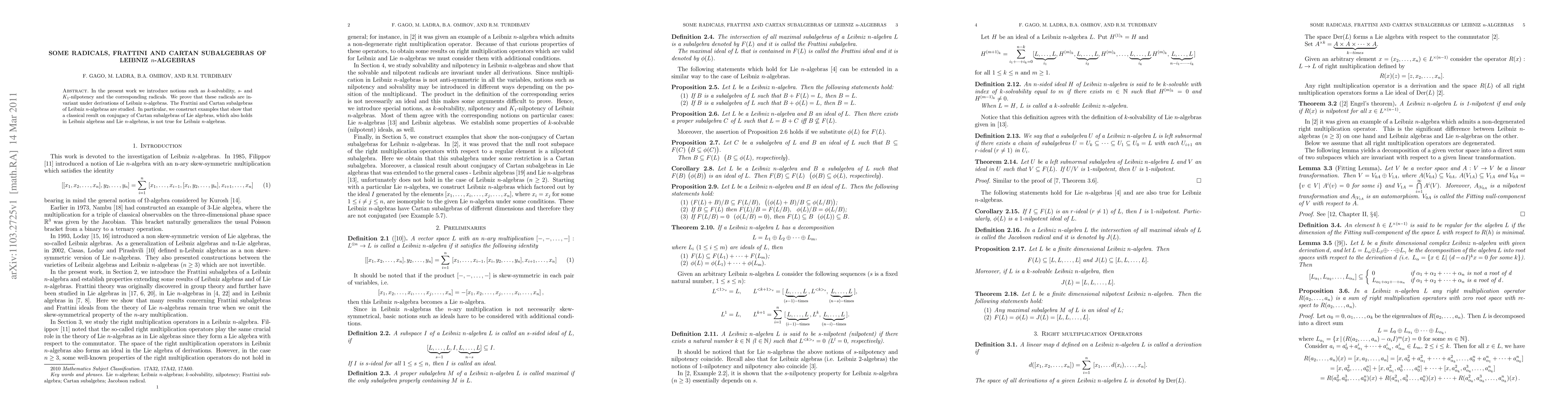 This paper introduces new concepts like $k$-solvability and $s$- and $K_1$-nilpotency for Leibniz $n$-algebras, demonstrating invariance of these radicals under derivations. It studies Frattini and Cartan subalgebras, revealing a classical result on conjugacy in Lie algebras does not apply to Leibniz $n$-algebras.