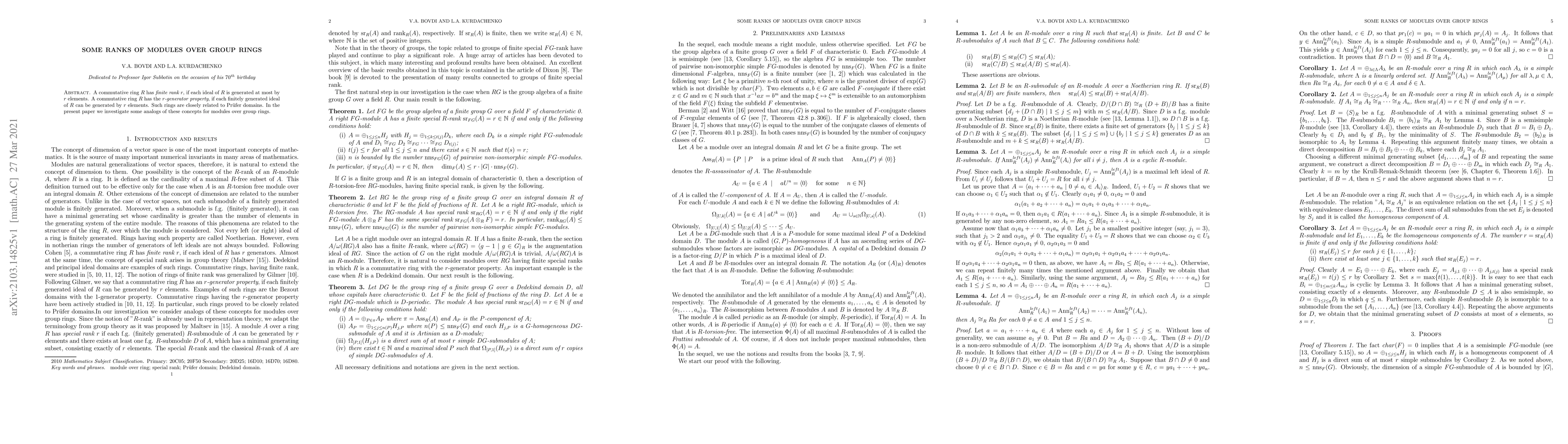 A commutative ring R has finite rank r, if each ideal of R is generated at most by r elements. A commutative ring R has the r-generator property, if each finitely generated ideal of R can be generated by r elements. Such rings are closely related to Pr\"ufer domains. In the present paper we investigate some analogs of these concepts for modules over group rings.