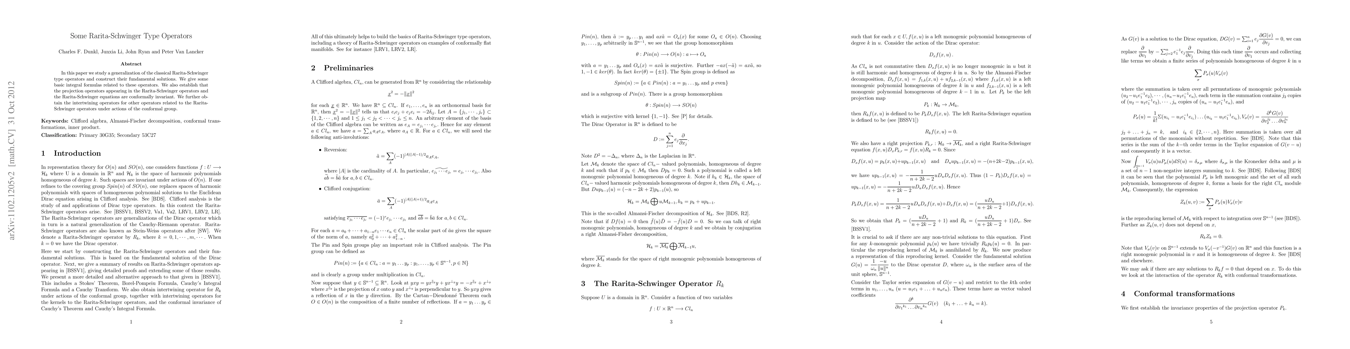 This paper generalizes classical Rarita-Schwinger type operators and constructs their fundamental solutions, providing integral formulas and demonstrating conformal invariance of related projection operators. It also establishes intertwining operators for these operators under conformal group actions.
