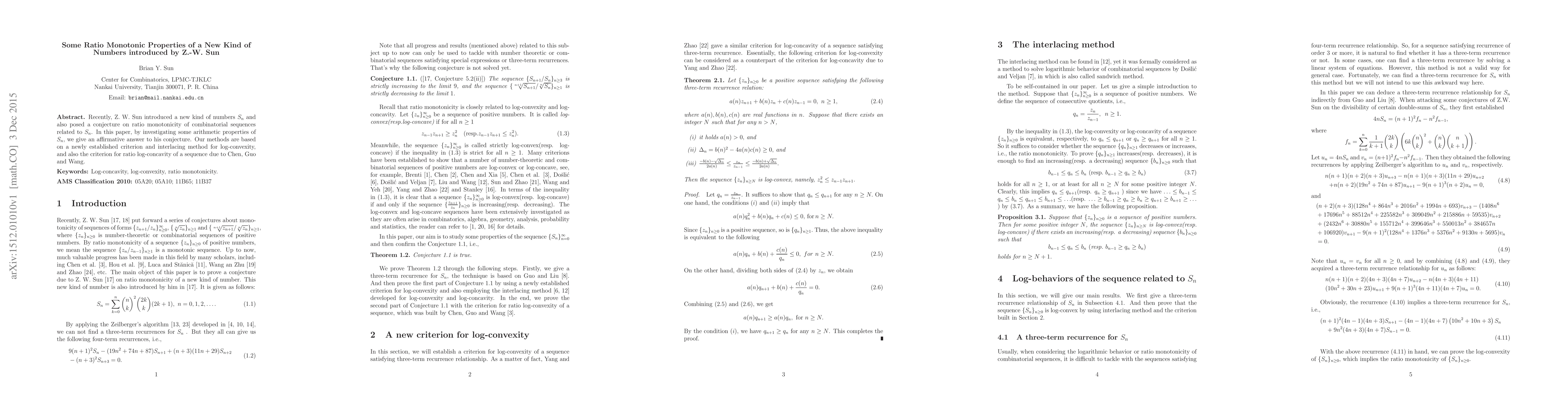 Recently, Z. W. Sun introduced a new kind of numbers $S_n$ and also posed a conjecture on ratio monotonicity of combinatorial sequences related to $S_n$. In this paper, by investigating some arithmetic properties of $S_n$, we give an affirmative answer to his conjecture. Our methods are based on a newly established criterion and interlacing method for log-convexity, and also the criterion for ratio log-concavity of a sequence due to Chen, Guo and Wang.