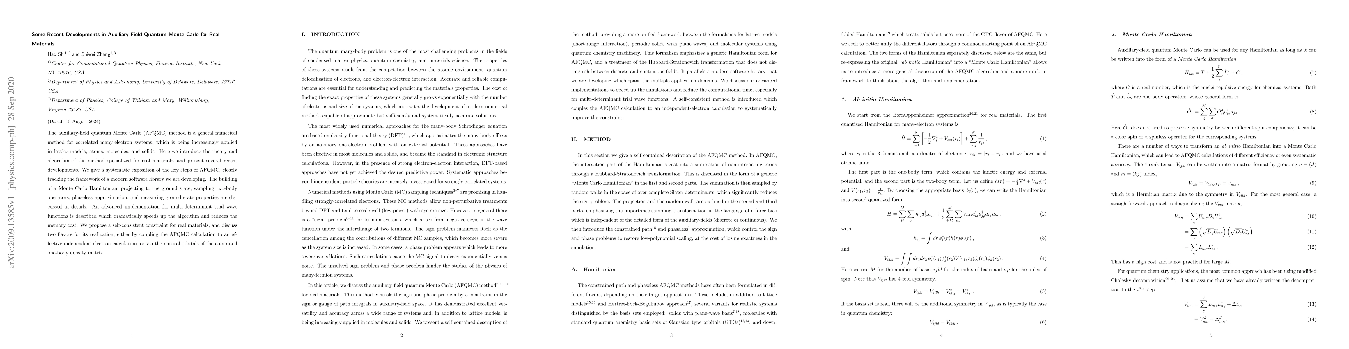 The auxiliary-field quantum Monte Carlo (AFQMC) method is a general numerical method for correlated many-electron systems, which is being increasingly applied in lattice models, atoms, molecules, and solids. Here we introduce the theory and algorithm of the method specialized for real materials, and present several recent developments. We give a systematic exposition of the key steps of AFQMC, closely tracking the framework of a modern software library we are developing. The building of a Monte Carlo Hamiltonian, projecting to the ground state, sampling two-body operators, phaseless approximation, and measuring ground state properties are discussed in details. An advanced implementation for multi-determinant trial wave functions is described which dramatically speeds up the algorithm and reduces the memory cost. We propose a self-consistent constraint for real materials, and discuss two flavors for its realization, either by coupling the AFQMC calculation to an effective independent-electron calculation, or via the natural orbitals of the computed one-body density matrix.