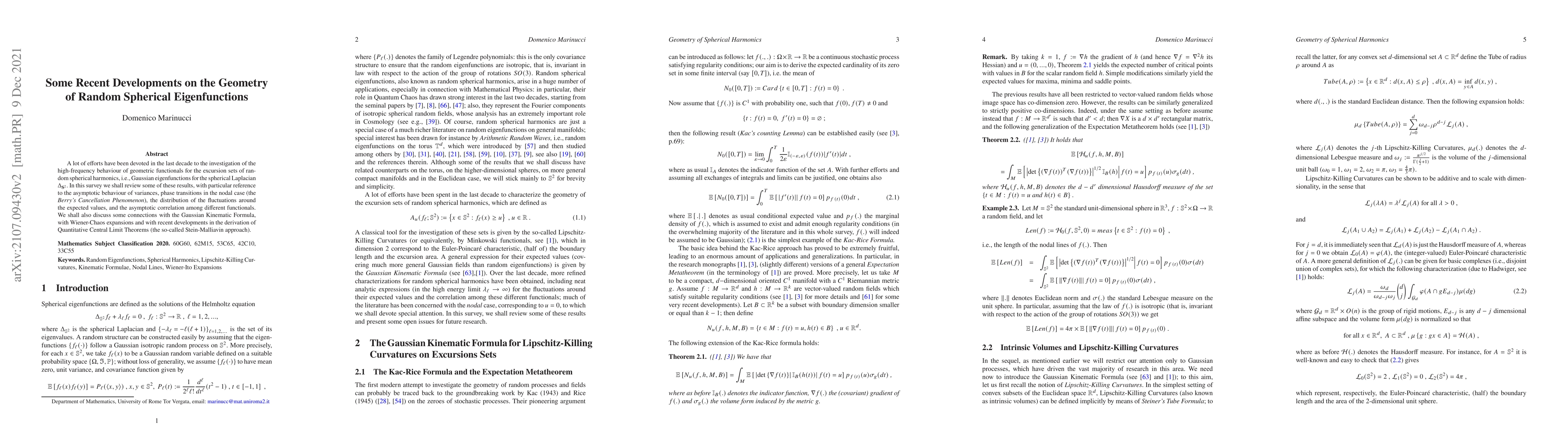 This paper surveys recent advancements in understanding the high-frequency behavior of geometric functionals for random spherical harmonics, focusing on variances, phase transitions, and correlations among these functionals, and linking these findings to the Gaussian Kinematic Formula and Quantitative Central Limit Theorems.