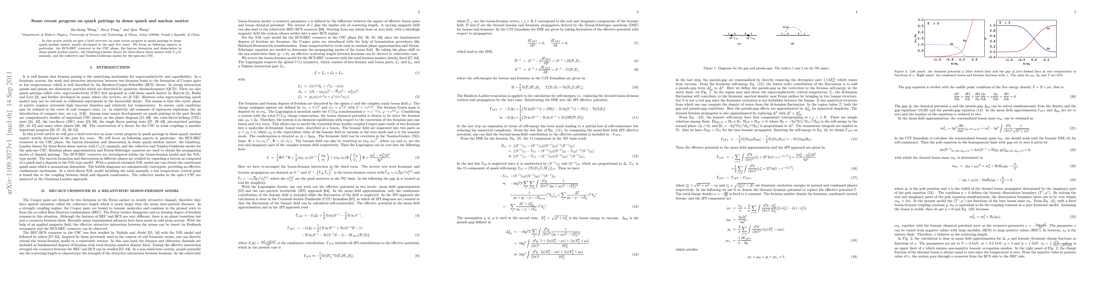This paper reviews recent advancements in quark pairing phenomena in dense quark and nuclear matter, focusing on the BCS-BEC crossover in the color-flavor-locked (CSC) phase, baryon dynamics, Ginzburg-Landau theory for three-flavor dense matter, and collective modes in spin-one CSC.