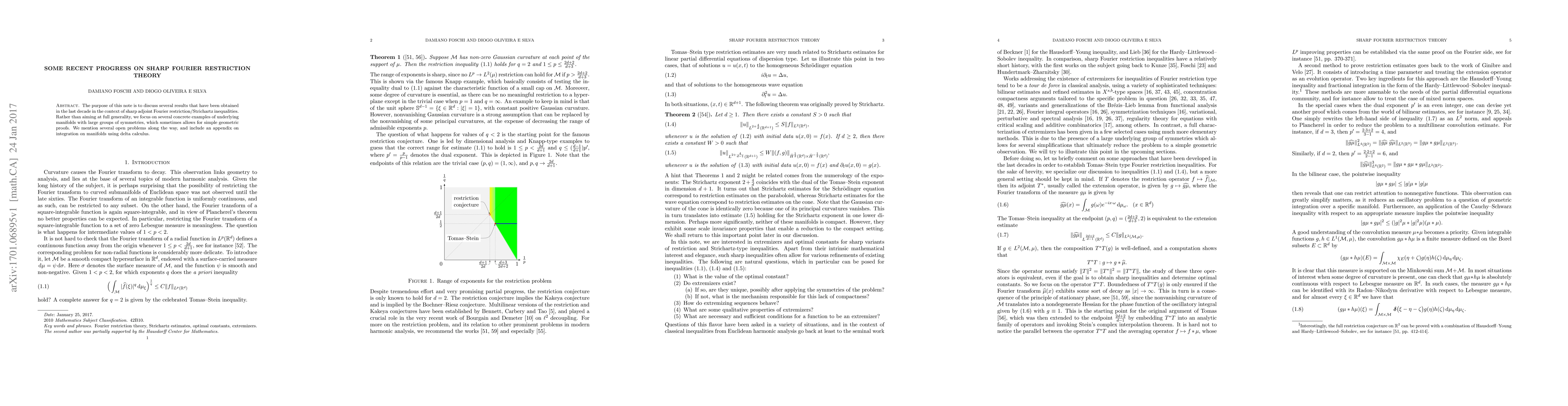 This paper reviews recent advancements in sharp Fourier restriction theory, focusing on specific manifolds with high symmetry and their geometric proofs, while also highlighting open problems and including an appendix on integration techniques.