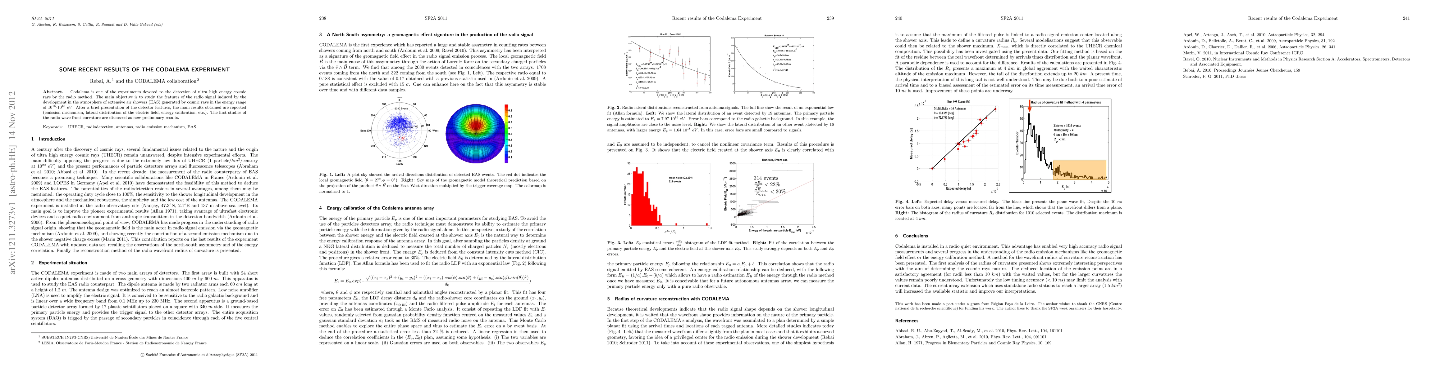 Codalema is one of the experiments devoted to the detection of ultra high energy cosmic rays by the radio method. The main objective is to study the features of the radio signal induced by the development in the atmosphere of extensive air showers (EAS) generated by cosmic rays in the energy range of 10 PeV-1 EeV . After a brief presentation of the detector features, the main results obtained are reported (emission mechanism, lateral distribution of the electric field, energy calibration, etc.). The first studies of the radio wave front curvature are discussed as new preliminary results.