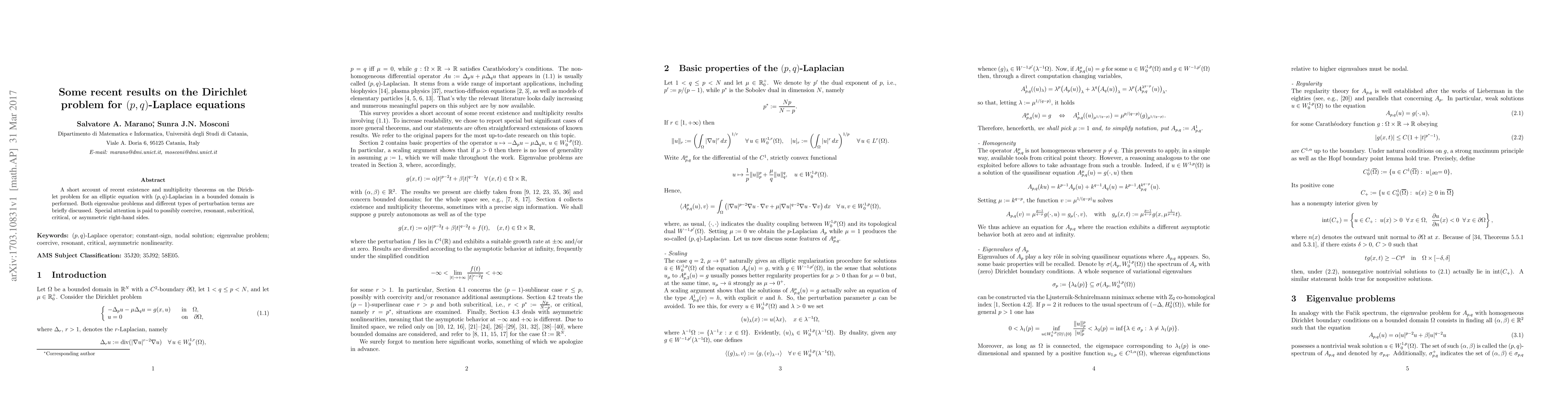 Recent research on the Dirichlet problem for (p,q)-Laplace equations has made progress on existence and multiplicity theorems for various perturbation terms and right-hand side conditions.