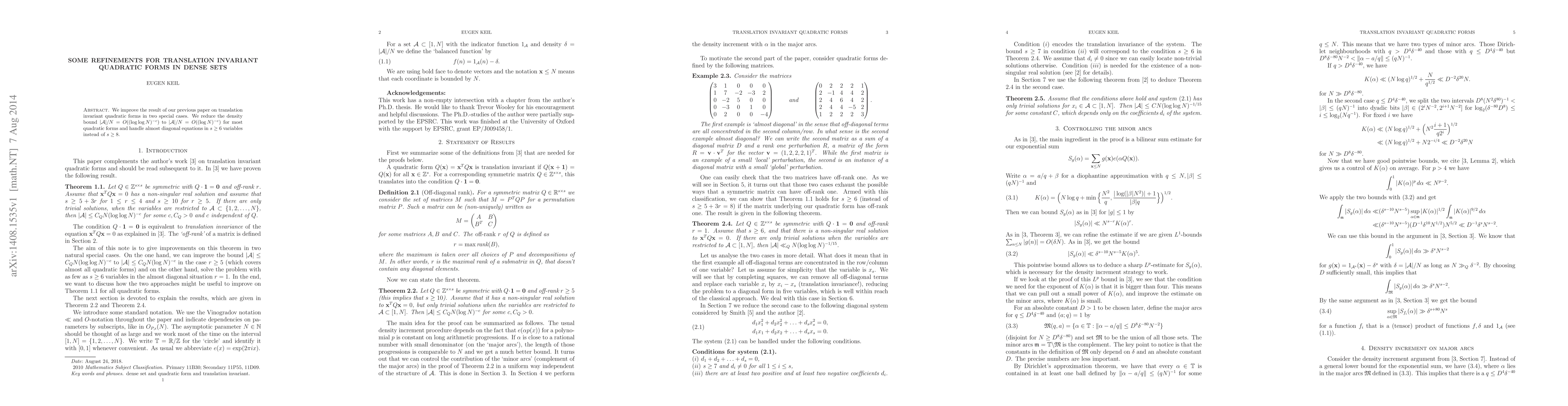 We improve the result of our previous paper on translation invariant quadratic forms in two special cases. We reduce the density bound $|\mathcal{A}|/N = O((\log\log N)^{-c})$ to $|\mathcal{A}|/N = O((\log N)^{-c})$ for most quadratic forms and handle almost diagonal equations in $s \geq 6$ variables instead of $s \geq 8$.
