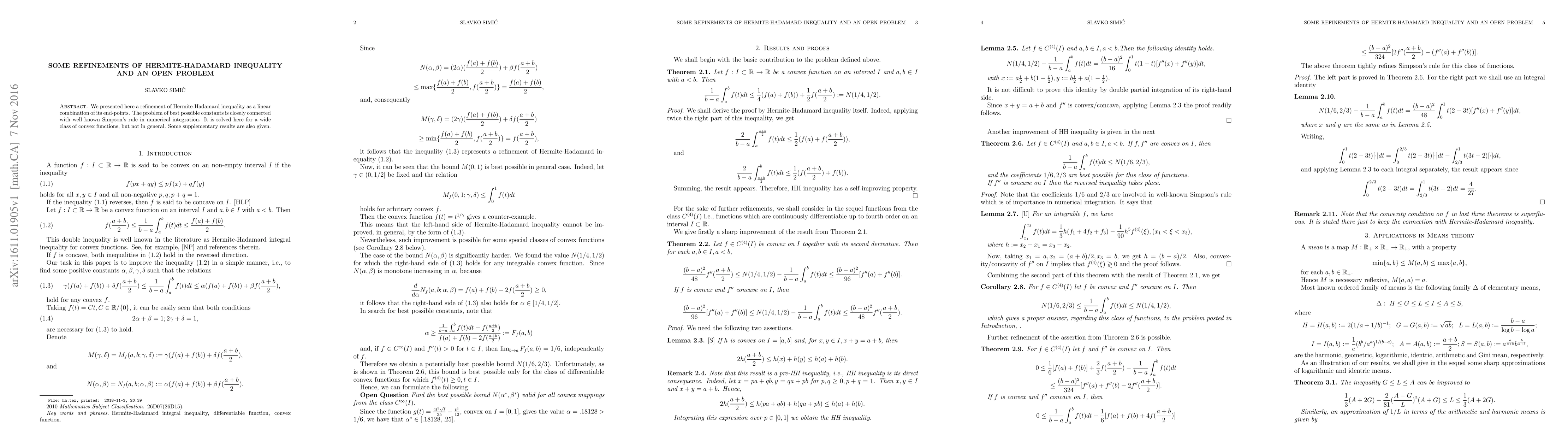 This paper refines the Hermite-Hadamard inequality as a linear combination of its endpoints, solving the problem of best possible constants for a broad class of convex functions, akin to Simpson's rule in numerical integration, while leaving the general solution as an open problem. Supplementary results are also provided.