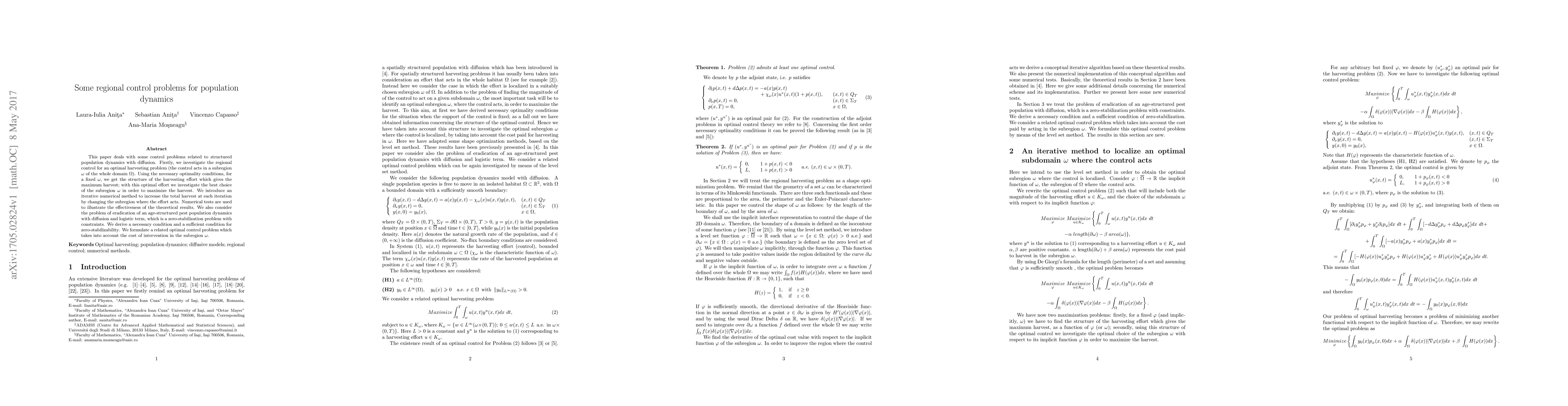 This paper investigates regional control strategies for optimal harvesting in population dynamics with diffusion, aiming to maximize harvest while considering the cost of intervention. It also explores eradication of age-structured pest populations with diffusion and logistic term, deriving conditions for zero-stabilizability and formulating an optimal control problem.