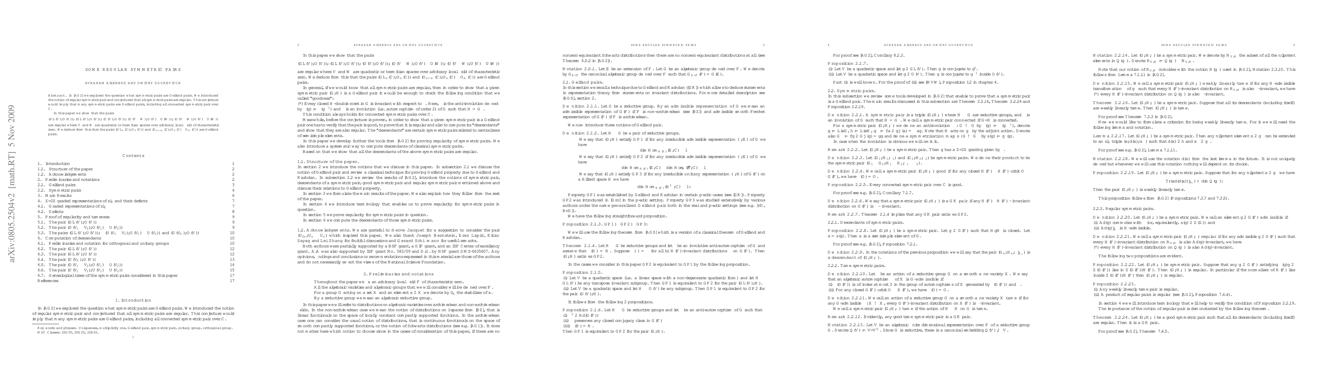 This paper demonstrates that several specific symmetric pairs, including $(GL(V),O(V))$ and $(O(V \oplus W),O(V) \times O(W))$, are regular. Consequently, it concludes that these pairs, including $(GL_n(\C),O_n(\C))$ and $(O_{n+m}(\C),O_n(\C) \times O_m(\C))$, are Gelfand pairs.