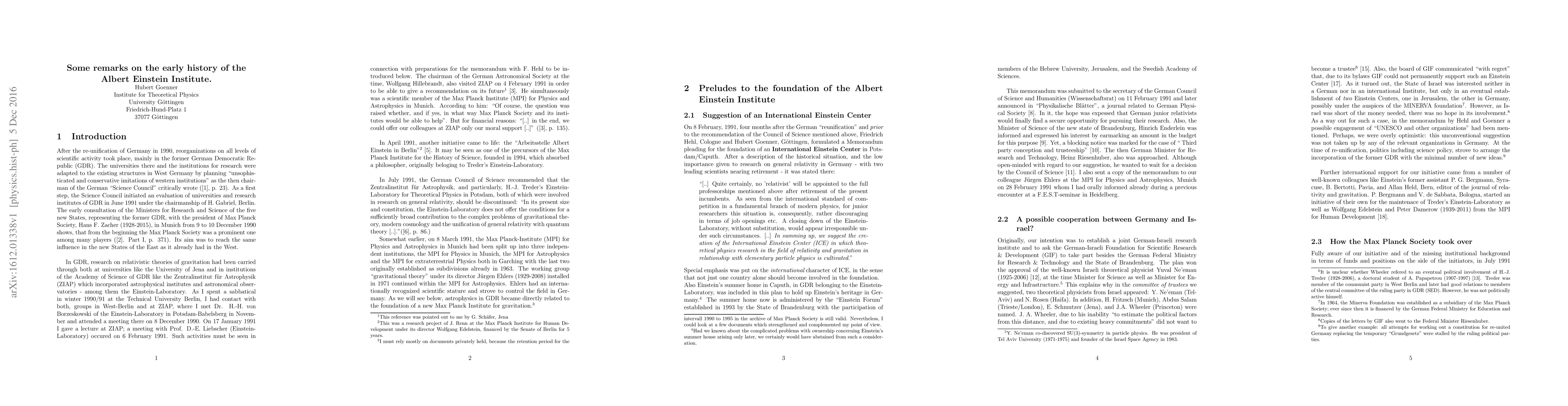 The genesis of the Max Planck Institute for Gravitational Physics (Albert Einstein Institute) after German re-unification as described here, shows that the history of the founding of the institute is not as simplistic as claimed e.g., in the presentation by the institute.Quite a few people and institutions have been involved.The institute now seems to be one of the largest institution for research in gravity, worldwide.
